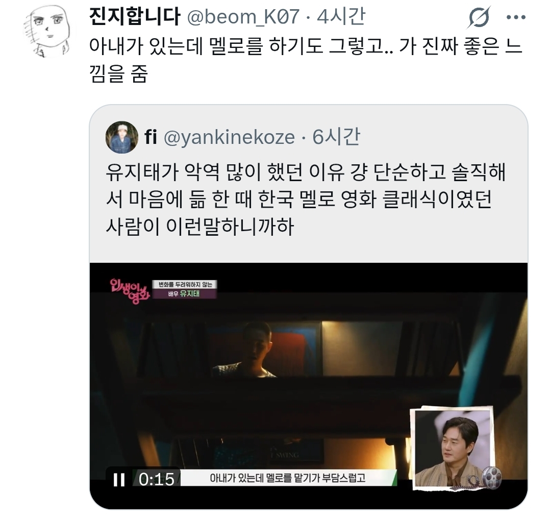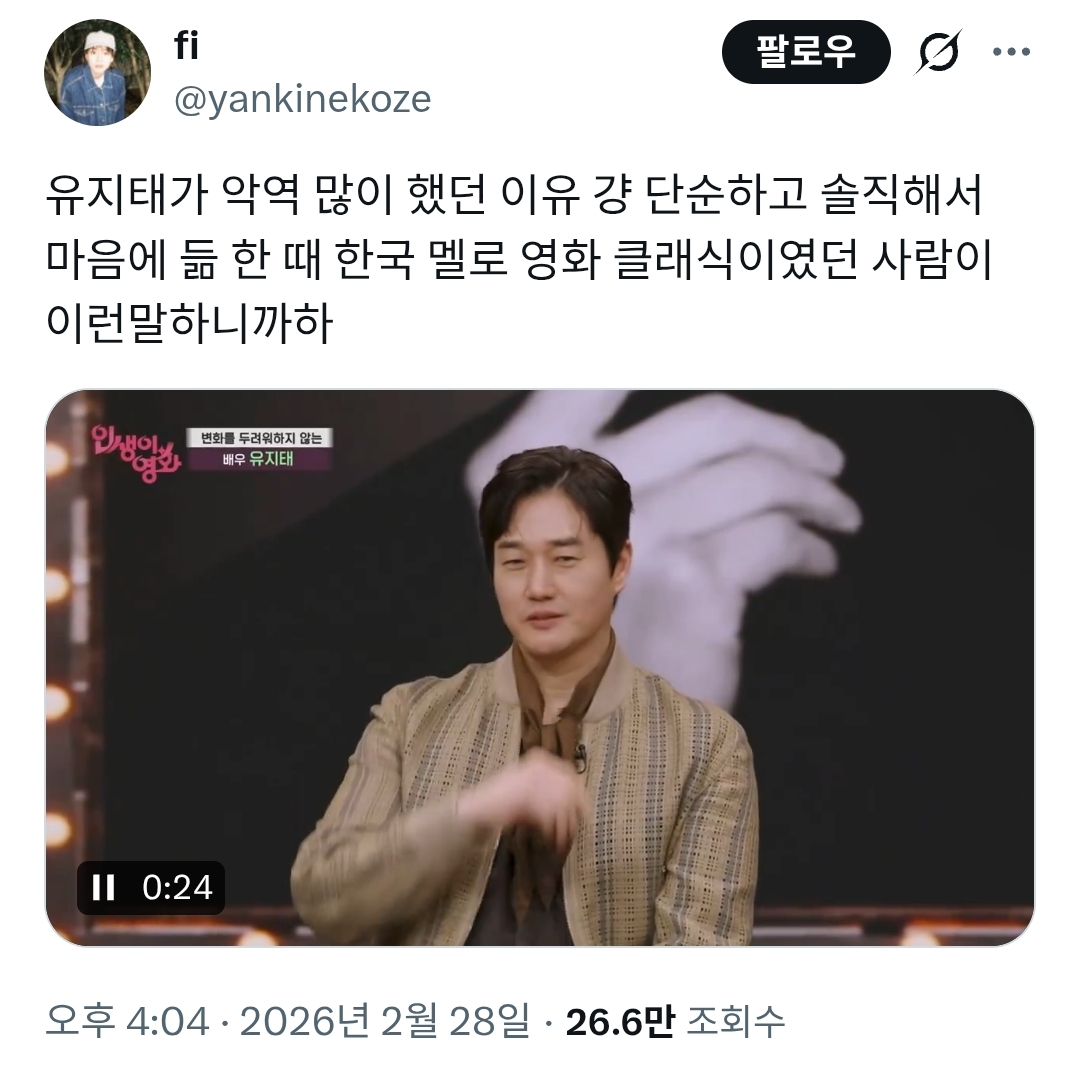 [스크랩] [흥미돋]유지태가 악역 많이 했던 이유 걍 단순하고 솔직해서 마음에 듦 작성자치와|작성시간26.02.28|조회수57,080 목록 댓글 59 글자크기 작게가 글자크기 크게가 영상 출처 :https:/com/i/status/2027641103286186269X의 fi님(@yankinekoze)유지태가 악역 많이 했던 이유 걍 단순하고 솔직해서 마음에 듦 한 때 한국 멜로 영화 클래식이였던 사람이 이런말하니까하x.com생각지도 못한 이유..(p) 다음검색 스크랩 원문 : 소주담(談) : 소소한 주민들의 이야기 현재 게시글 추가 기능 열기 북마크 공유하기 신고 센터로 신고 댓글 댓글 59 댓글쓰기 답글쓰기 댓글 리스트 답댓글 작성자요플레오프룻 | 작성시간 26.03.01 누구야 ㅁㅊ 답댓글 작성자맑눈광 | 작성시간 26.03.01 요플레오프룻 이름 쓰긴 그런데 이미 미투로 나락가셨어 ㅠ 작성자pachimari | 작성시간 26.03.01 와… 작성자리에 스튜디오 | 작성시간 26.03.01 굿.. 작성자당신을 본 적은 없지만 응원합니다 | 작성시간 26.03.02 캬 댓글 전체보기