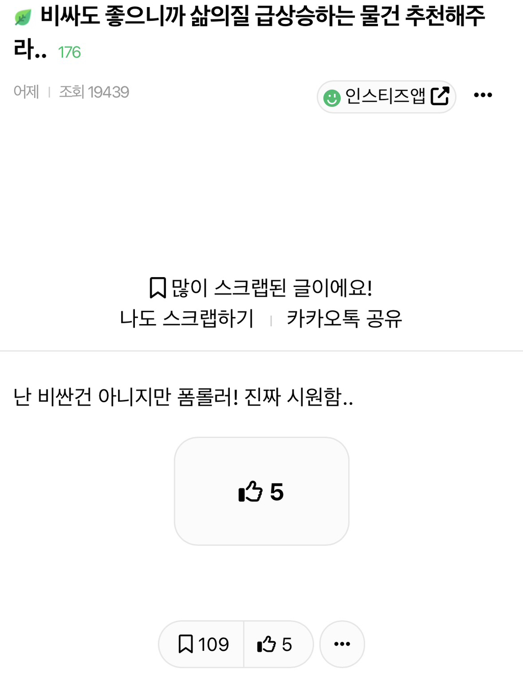 [흥미돋]비싸도 좋으니까 삶의질 급상승하는 물건 추천해주라 작성자엥엥ㅇ|작성시간26.02.28|조회수37,387 목록 댓글 84 글자크기 작게가 글자크기 크게가 출처: https://instiz.net/name/65769910난 비싼건 아니지만 방한화 ㅋㅋㅋ원래 추위많이타서... 다음검색 현재 게시글 추가 기능 열기 북마크 공유하기 신고 센터로 신고 댓글 댓글 84 댓글쓰기 답글쓰기 댓글 리스트 작성자Kimmmuyiii | 작성시간 26.03.01 차 작성자베노피 영원해 | 작성시간 26.03.01 차... 작성자oh okay | 작성시간 26.03.01 건조기 작성자카다이프 총리 | 작성시간 26.03.01 건조기우연히 건조기가 기본 옵션인 집에서 살게 됐는데 이젠 건조기 없이는 못 살아; 작성자김냥몀 | 작성시간 26.03.01 공부하면 패드나 탭.. 너무 흔한감?ㅌㅋㅋㅋㅋ 갤탭 존나 큰거 비싸게주고 삿는데 유튜브머신이다가 자격증공부하고 너무 잘쓰게된게 기뻐서ㅋㅋㅋ 댓글 전체보기