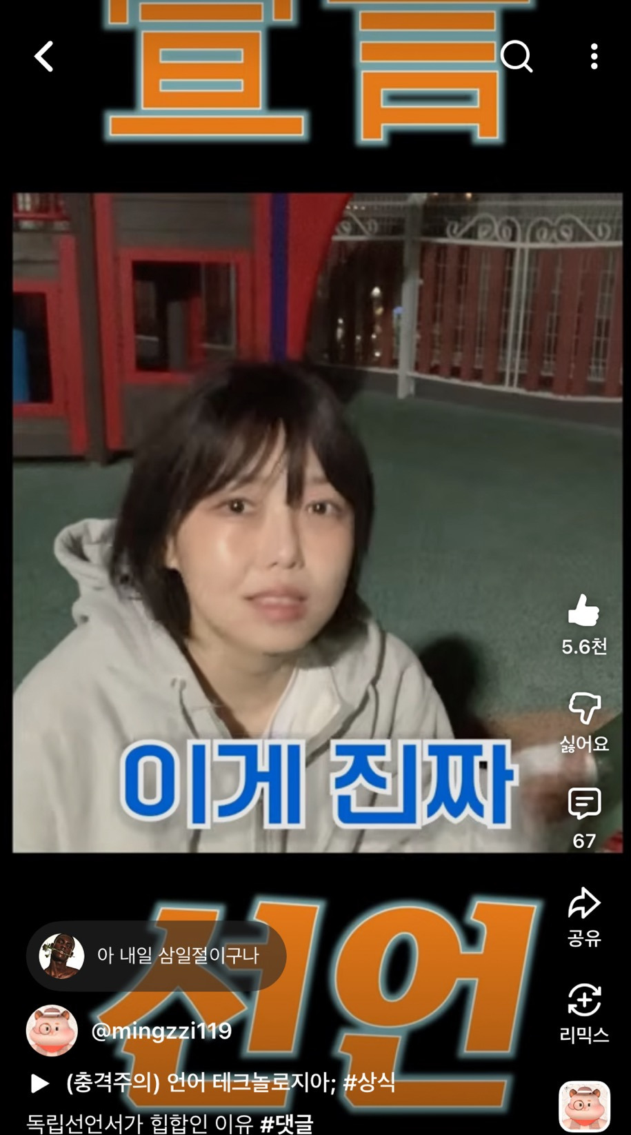[흥미돋]독립선언서가 힙합인 이유 작성자planB|작성시간26.03.01|조회수22,559 목록 댓글 27 글자크기 작게가 글자크기 크게가 출처: 밍찌채널 https://youtube.com/shorts/ILx0RpVjQ08?si=piShBZwaB7zsnrb3 다음검색 현재 게시글 추가 기능 열기 북마크 공유하기 신고 센터로 신고 댓글 댓글 27 댓글쓰기 답글쓰기 댓글 리스트 작성자STAY AWESOME!! | 작성시간 26.03.01 선언..!!!!! 작성자닥스 | 작성시간 26.03.01 맞아 멋있음 선언한거 작성자나는야 뚜벅초 | 작성시간 26.03.01 멋있다 작성자난 다 잘 돼 | 작성시간 26.03.01 하 소름 진짜 ㅠㅠㅠㅠㅠ 작성자다니대니 | 작성시간 26.03.02 보다가 울컥했어 생각해보니까 선언이란거에 대해 별생각없었는데 다시금 감사합니다 댓글 전체보기