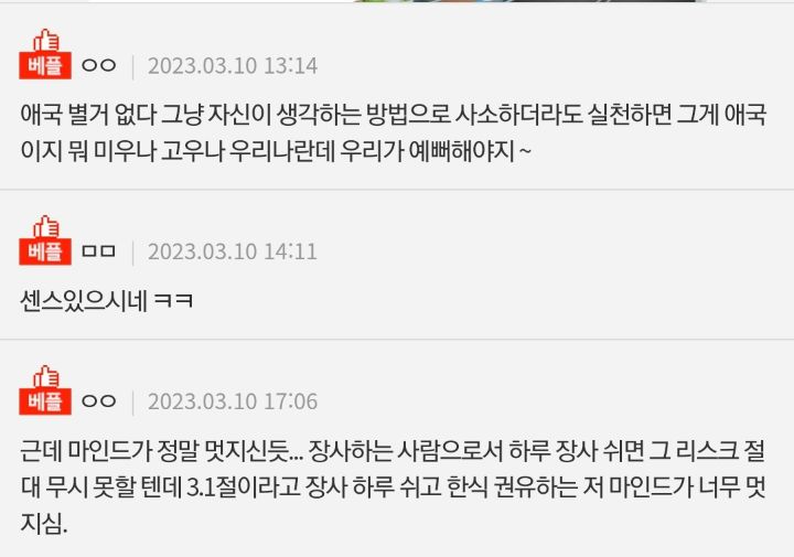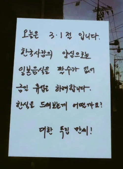 [스크랩] [흥미돋]양심상 하루 휴업한 어느 식당 작성자flflf|작성시간26.03.01|조회수66,116 목록 댓글 24 글자크기 작게가 글자크기 크게가 출처 : https://m.pann.nate.com/talk/369534460 다음검색 스크랩 원문 : *여성시대* 차분한 20대들의 알흠다운 공간 현재 게시글 추가 기능 열기 북마크 공유하기 신고 센터로 신고 댓글 댓글 24 댓글쓰기 답글쓰기 댓글 리스트 작성자가발이라는뚜껑 | 작성시간 26.03.01 굿굿 작성자소형준 | 작성시간 26.03.01 공휴일에 장사 포기하기 쉽지 않은데 멋지시네 작성자크리스터럭 | 작성시간 26.03.01 오히려 호감 작성자잠옷추천해줄사람 | 작성시간 26.03.01 굿 작성자호로록 삼켜 | 작성시간 26.03.01 대단하시다 댓글 전체보기