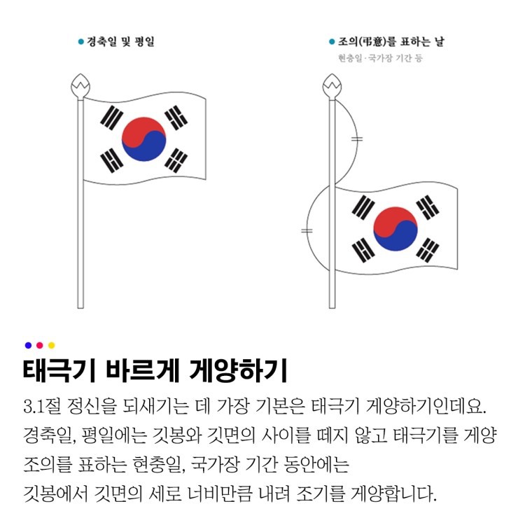 [스크랩] [흥미돋]3.1절 올바른 태극기 게양법 작성자무탈해|작성시간26.03.01|조회수4,825 목록 댓글 12 글자크기 작게가 글자크기 크게가 출처 :https://poldaejeon.blog.me/221218612867태극기 게양하는데 우리아파트는 해놓은 집이 거의 없길래 찾아서 올려봐용^3^여시들도 모두 태극기 게양 합시다! 2시간정도밖에 안남았어 ㅠㅠ 다음검색 스크랩 원문 : *여성시대* 차분한 20대들의 알흠다운 공간 현재 게시글 추가 기능 열기 북마크 공유하기 신고 센터로 신고 댓글 댓글 12 댓글쓰기 답글쓰기 댓글 리스트 작성자한반도고유종 | 작성시간 26.03.01 완 작성자광안리뷰 | 작성시간 26.03.01 완!! 작성자슬프고도 아름다운 | 작성시간 26.03.01 완! 할 수 있는 작은 일부터 시작 작성자새싹 | 작성시간 26.03.01 새벽1시에 걸었음 작성자자랒오 | 작성시간 26.03.01 우리집도 거는데가 없다.. 댓글 전체보기