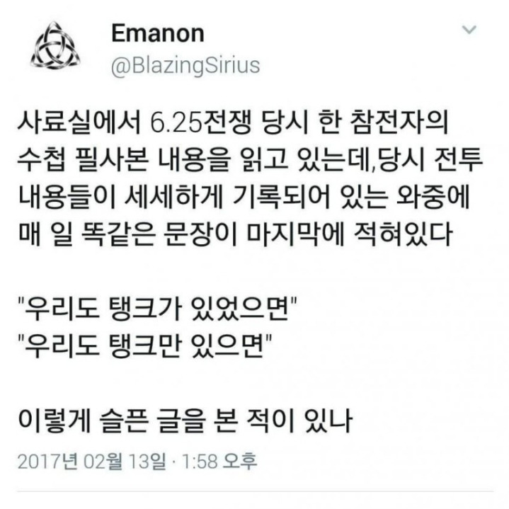 [흥미돋]한국군이 뼈에 새겼던 문장 작성자출근하기시러요ㅜ|작성시간26.03.01|조회수11,915 목록 댓글 15 글자크기 작게가 글자크기 크게가 출처: https://m.cafe.daum.net/subdued20club/ReHf/2885679?svc=cafeapp한국군이 뼈에 새겼던 문장출처 : https://m.ruliweb.com/community/board/300143/read/48611273m.cafe.daum.net 다음검색 현재 게시글 추가 기능 열기 북마크 공유하기 신고 센터로 신고 댓글 댓글 15 댓글쓰기 답글쓰기 댓글 리스트 작성자이디야미니코코크런치 | 작성시간 26.03.01 ㅜㅠㅜ이렇게 편하게 누워있을수있는거도 이분들덕분이지 항상감사합니다 작성자먹보뭉보 | 작성시간 26.03.01 ㅜㅜ 작성자냠먐 | 작성시간 26.03.01 슬퍼 작성자당소소 | 작성시간 26.03.01 ㅠㅠㅠㅠ감사합니다 작성자내꿈은자가격리 | 작성시간 26.03.01 ㅠㅠ슬프다... 진짜 열악한 조건이었는데 댓글 전체보기