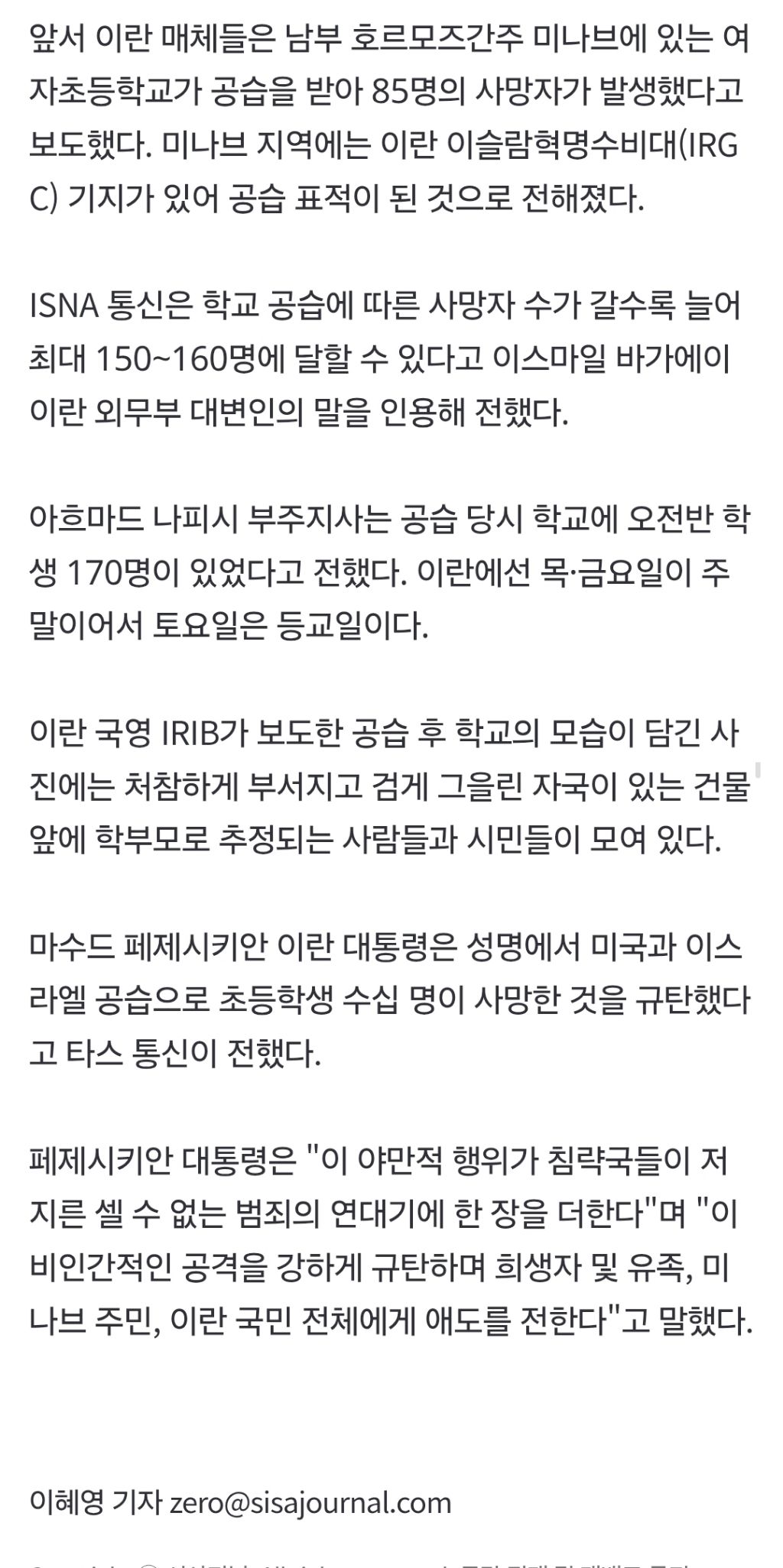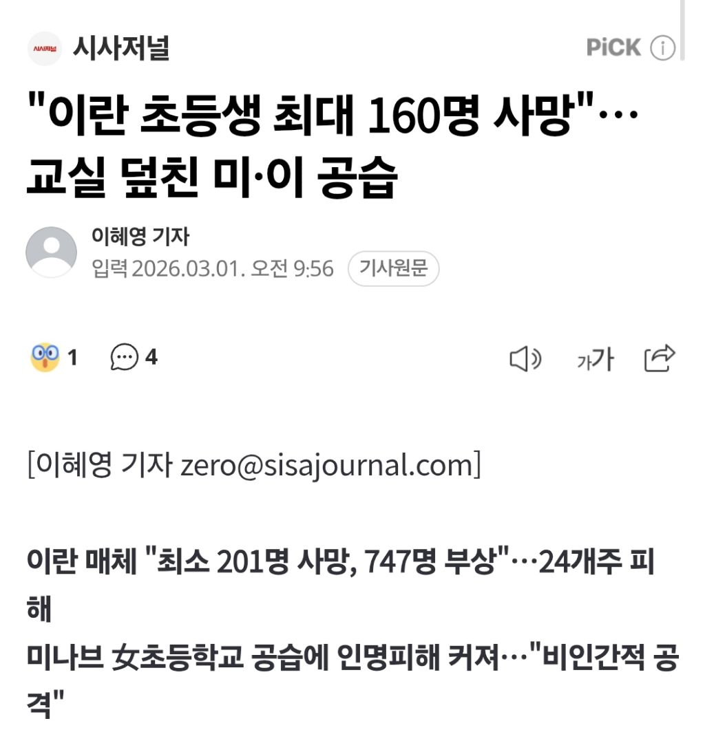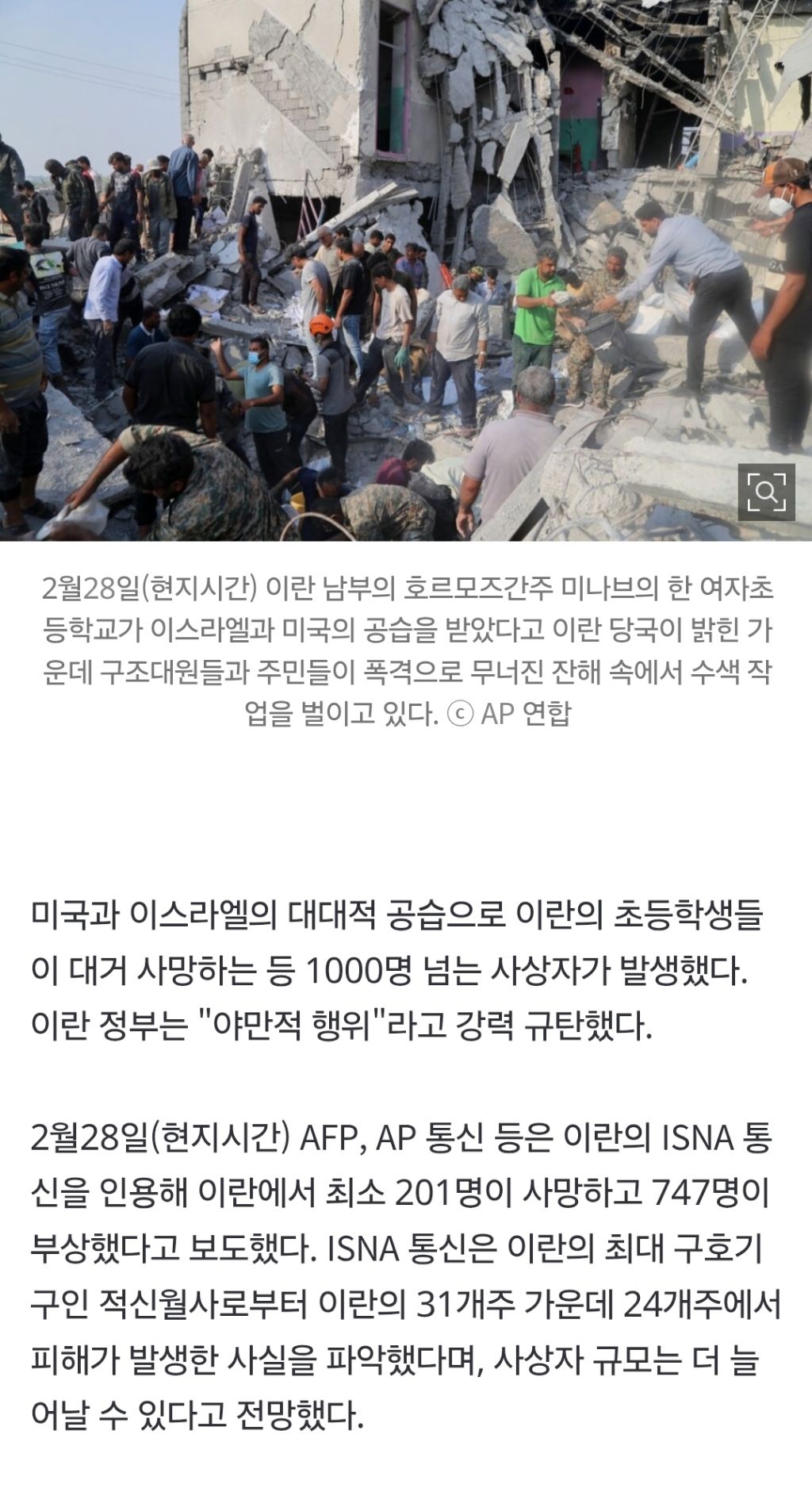 [칵.cxxx]"이란 초등생 최대 160명 사망"…교실 덮친 미·이 공습 작성자unknown22|작성시간26.03.01|조회수10,719 목록 댓글 27 글자크기 작게가 글자크기 크게가 출처: https://naver.me/xQJjfPo7"이란 초등생 최대 160명 사망"…교실 덮친 미·이 공습이란 매체 "최소 201명 사망, 747명 부상"…24개주 피해 미나브 女초등학교 공습에 인명피해 커져…"비인간적 공격" 미국과 이스라엘의 대대적 공습으로 이란의 초등학생들이 대거 사망하는 등 1000n.news.naver.com 다음검색 현재 게시글 추가 기능 열기 북마크 공유하기 신고 센터로 신고 댓글 댓글 27 댓글쓰기 답글쓰기 댓글 리스트 작성자할라할라할라지아 | 작성시간 26.03.01 애들은 뭔죄야ㅜ 작성자보라유부초밥 | 작성시간 26.03.01 맘이 안좋다 작성자자모두다쉿 | 작성시간 26.03.01 학교랑 병원은 건드리지 않는게 암묵적인 합의 아니였어?? 작성자SKIMMILK | 작성시간 26.03.01 이유가 뭐든간에 전쟁은 안돼 ㅠㅠ 작성자짜발난다고 | 작성시간 26.03.01 아 진짜 미친 거 아니야... 댓글 전체보기