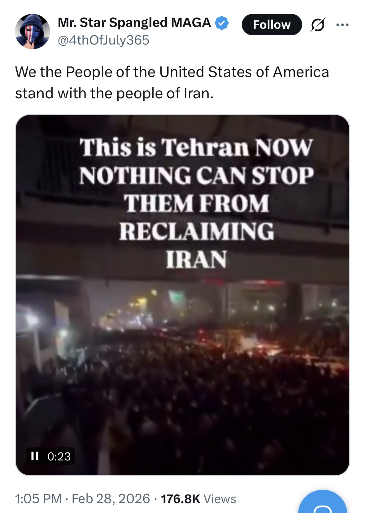 [흥미돋]이란 테헤란에서 민중 봉기 시작.x 작성자Sunmoonstar02|작성시간26.03.01|조회수13,347 목록 댓글 16 글자크기 작게가 글자크기 크게가 출처: https://x.com/4thOfJuly365/status/2027852633432572328?s=20 다음검색 현재 게시글 추가 기능 열기 북마크 공유하기 신고 센터로 신고 댓글 댓글 16 댓글쓰기 답글쓰기 댓글 리스트 작성자페퍼로니베이글칩 | 작성시간 26.03.01 가자!! 작성자바라는대로 | 작성시간 26.03.01 꼭 성공하세요..! 작성자배추김치볶음 | 작성시간 26.03.01 화이팅! 작성자모모@ | 작성시간 26.03.01 힘내세요!!!! 작성자뭐래는거야 | 작성시간 26.03.01 이란 파이팅!!!!!!!!!!! 댓글 전체보기
