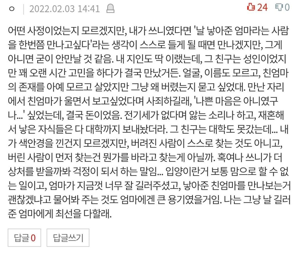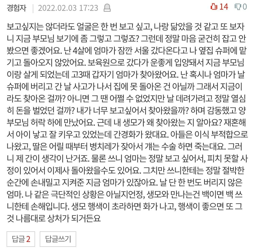 작성자오잉또잉머임 작성시간 26.03.01 날 한번도 버리지 않은 부모(키워두신분) 가 있다는말....공감되네....