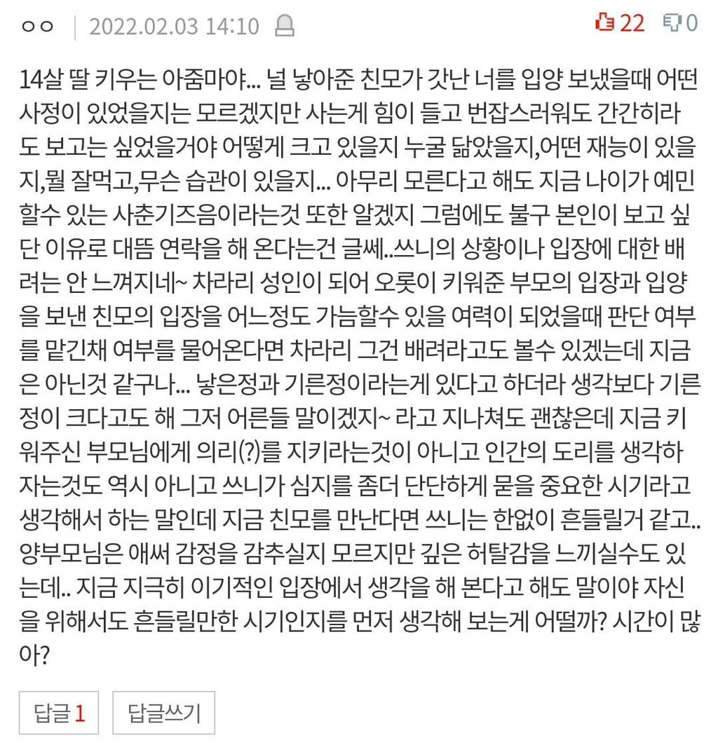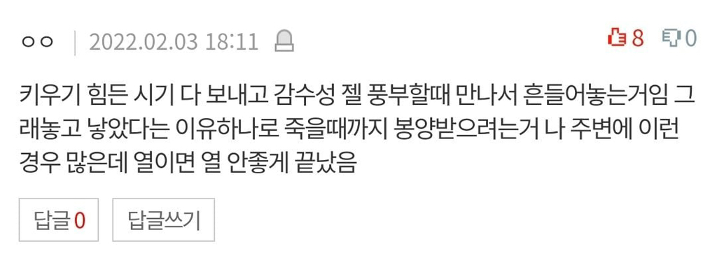 작성자줄곧 작성시간 26.03.01 솔직히 뭐 바라고 보자는건지 모르겟음;;; 키우지도 않아늏고 효도바랄듯