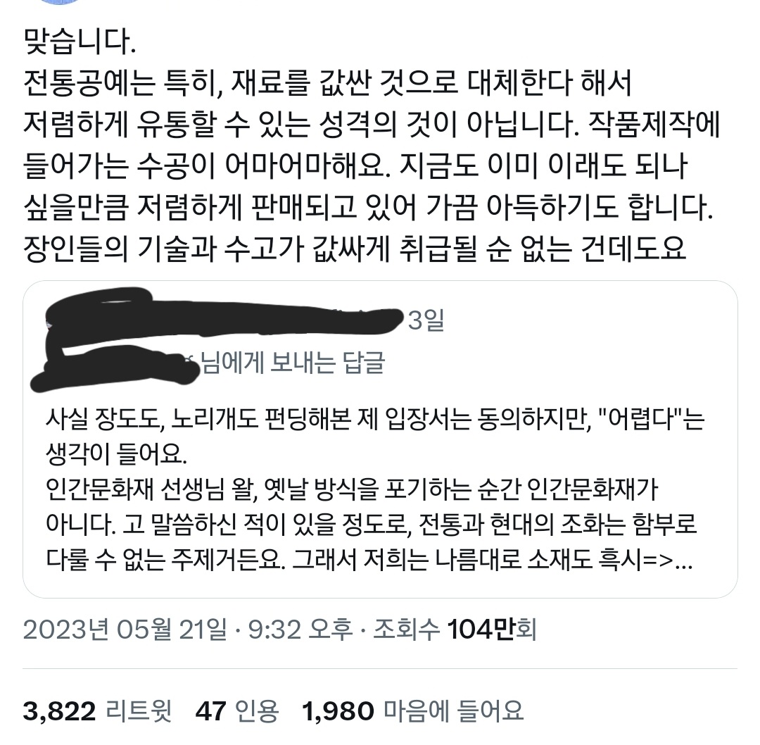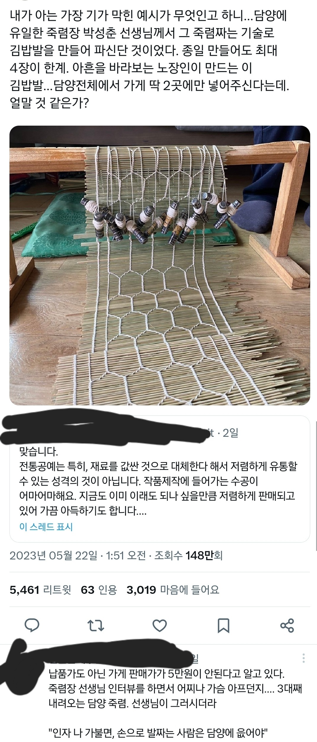 담양 죽렴장인 무형문화재 박성춘 선생에 대한 인용트윗이