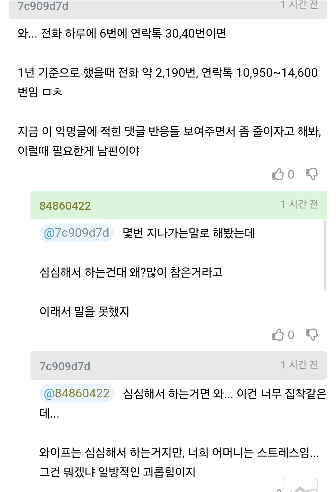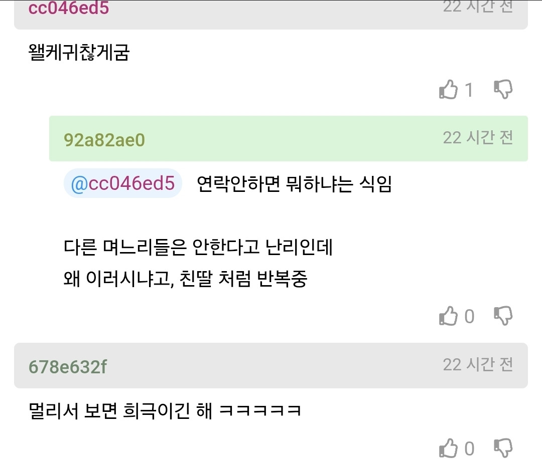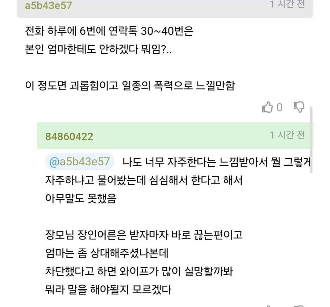 작성자슬러쉬는 파란색 작성시간 26.03.02 심심해서 한다고하몀 남편한테 안하고 왜 시댁에 하지? 저런것도 한두번이지 용건없이 순전히 심심하다는이유로 하루6번이면 나같아도 차단할것같긴해...상처받아도 어쩌겠음...