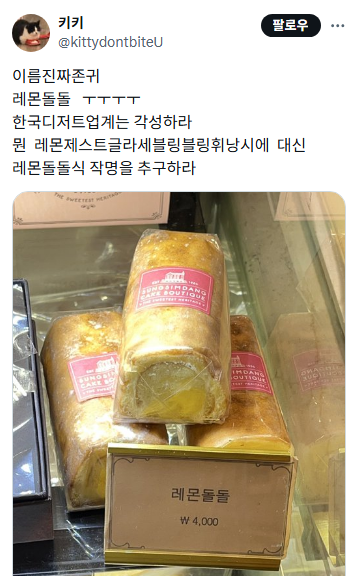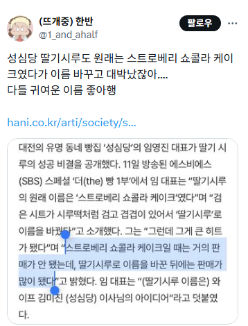 [스크랩] [흥미돋]이름 바꾸고 대박났다는 성심당 딸기시루 작성자이수현|작성시간26.03.01|조회수58,388 목록 댓글 58 글자크기 작게가 글자크기 크게가 출처: https://x.com/1_and_ahalf/status/1914895244568809858 https://www.hani.co.kr/arti/society/society_general/1182103.html안 팔리던 성심당 ‘딸기시루’ 이름 바꾸고 대박…“아내 아이디어”‘딸기시루’의 원래 이름은 ‘스트로베리 쇼콜라 케이크’였다. 이 ‘개명’으로 케이크의 폭발적인 인기가 시작됐다. 대전의 유명 동네 빵집 ‘성심당’의 임영진 대표가 딸기 시루의 성공 www.hani.co.kr 다음검색 스크랩 원문 : *여성시대* 차분한 20대들의 알흠다운 공간 현재 게시글 추가 기능 열기 북마크 공유하기 신고 센터로 신고 댓글 댓글 58 댓글쓰기 답글쓰기 댓글 리스트 작성자다이아리 | 작성시간 26.03.01 한글네임 너무 좋고 귀여워 작성자모든 것에 감사합니다 | 작성시간 26.03.01 딸기시루막내 라는 이름이 너무 귀야움.. 작성자과일이좋아 | 작성시간 26.03.01 레몬돌돌 작성자Amoroso | 작성시간 26.03.02 이름 왤케 귀엽고 앙증맞냐구 ㅠ 작성자에헤헴 | 작성시간 26.03.09 와 레몬돌돌 가격 무슨일 저게 4천원이라고? 댓글 전체보기