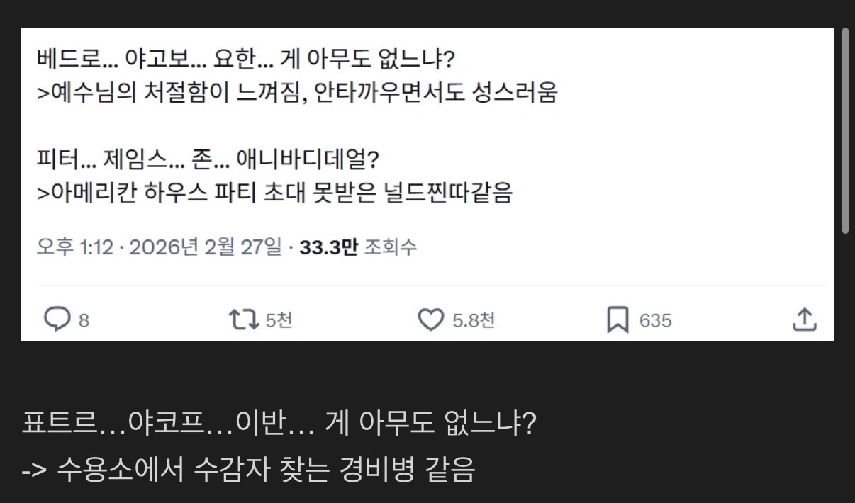 [흥미돋]성경 속 인명을 영어로 안 쓰는 이유 작성자뚱쭝한 고양이|작성시간26.03.01|조회수38,502 목록 댓글 45 글자크기 작게가 글자크기 크게가 출처: https://theqoo.net/square/4111005442사실은 원어발음에 가깝게 적은거긴 함 다음검색 현재 게시글 추가 기능 열기 북마크 공유하기 신고 센터로 신고 댓글 댓글 45 댓글쓰기 답글쓰기 댓글 리스트 작성자guineabra | 작성시간 26.03.01 ㅅㅂ이집트 ㅋㅋㅋㅋㅋㅋㅋㅋㅋㅋ 작성자이츠실제상황 | 작성시간 26.03.01 ㅋㅋ 씨발ㅋㅋㅋ 작성자T쌉T인팁T | 작성시간 26.03.01 니케 - 나이키 ㅋㅋ 작성자라타타탓타 | 작성시간 26.03.01 여호수아 -모르지만 ㅈㄴ 홀리해보임 조쉬 - 찐따 작성자여자스포츠보세요 | 작성시간 26.03.02 마리아 : 홀리메리 : 갑자기 너무 친근 ;; 댓글 전체보기