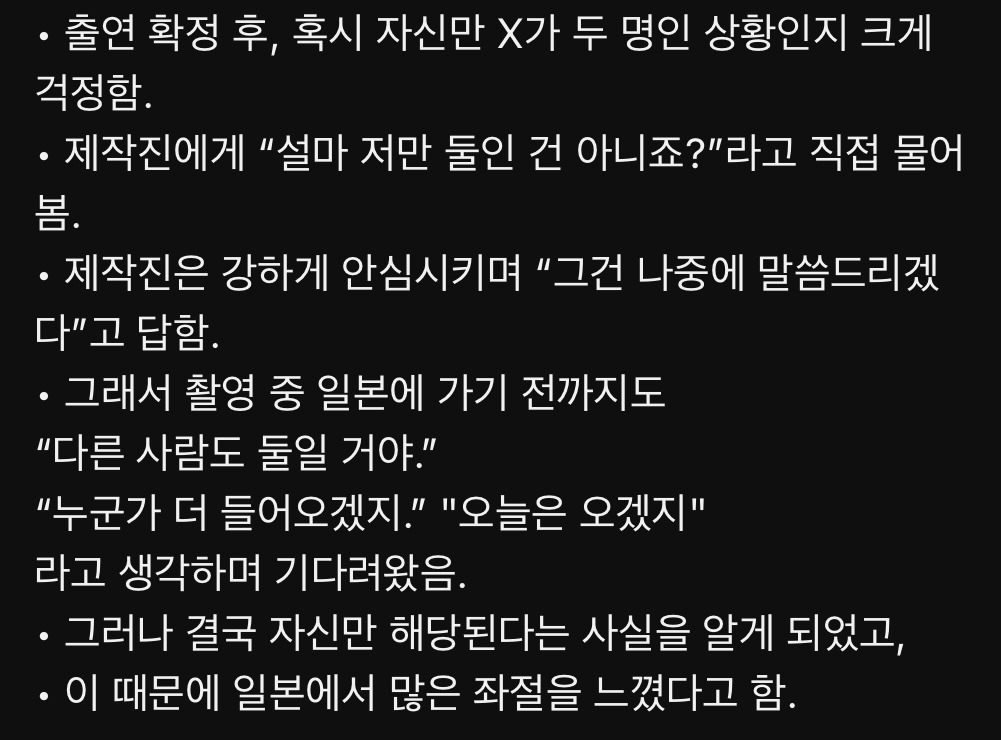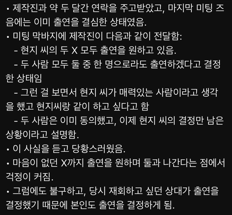 [스크랩] [흥미돋]환승연애 다시 돌아간다면 출연 안 한다는 현지 작성자덥스텝|작성시간26.03.01|조회수25,571 목록 댓글 33 글자크기 작게가 글자크기 크게가 출처: 여성시대 프라블럼노프라블럼역대 최고 성과로 환연 제작진+MC는 포상휴가 간대https://youtu.be/9QcdsnIAIEw?si=GRtAGeCsKomExLyW 다음검색 스크랩 원문 : *여성시대* 차분한 20대들의 알흠다운 공간 현재 게시글 추가 기능 열기 북마크 공유하기 신고 센터로 신고 댓글 댓글 33 댓글쓰기 답글쓰기 댓글 리스트 작성자시홍스 | 작성시간 26.03.01 헐 이거 왜 비공 됐어? 보면서 제작진 뭔가 햇는데 작성자콬훗ㅁ헝 | 작성시간 26.03.01 제작진쪽에서 비공하라햇나보넼ㅋㅋㅋㅋ 참나... 작성자뭐래진짜후 | 작성시간 26.03.02 제작진 진짜 못됐다 ㅋㅋㅋㅋ 편집이라도 그럼 좀 잘해줘야하는거 아냐? 진짜 최악임 작성자버러지헌터 | 작성시간 26.03.02 현지 너무 불쌍...욕은 욕대로 먹었는데 제작진 너무하다진짜 일반인인데 보호는해줘야지 작성자펜타막아 | 작성시간 26.03.02 와… 댓글 전체보기