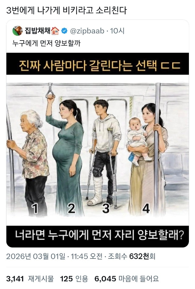 [흥미돋]진짜 사람마다 갈린다는 선택 ㄷㄷ 작성자Sunmoonstar02|작성시간26.03.01|조회수55,072 목록 댓글 377 글자크기 작게가 글자크기 크게가 출처: https://www.dmitory.com/issue/402018307이슈/유머 - 진짜 사람마다 갈린다는 선택 ㄷㄷ익명 정보 커뮤니티 사이트www.dmitory.com 다음검색 현재 게시글 추가 기능 열기 북마크 공유하기 신고 센터로 신고 댓글 댓글 377 댓글쓰기 답글쓰기 댓글 리스트 작성자저는 남자1지만 | 작성시간 26.03.03 1 작성자에리애비 | 작성시간 26.03.03 1만 양보 작성자됴롱롱맨돗 | 작성시간 26.03.03 옆자리2명 일으키고 여자들앉혀 작성자암어링고링고 | 작성시간 26.03.04 난 4번 한손으로 애 들고 한손으로 잡으면 넘어져 작성자Doctor Strange | 작성시간 26.03.14 4123? 애한손으로 잡고있는거 위험해보임 저기서 다 넘어졌을때 4만 두사람이 다치잖아 넘어지면 애한테 치명적일듯 갓난애가 젤 약자다 댓글 전체보기