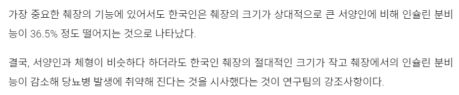 3. 인슐리 분비 기능이 서양인보다 한국인이 36.5% 떨어짐