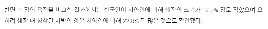 1. 평균적으로 서양인보다 한국인의 췌장크기가 12.3% 작음