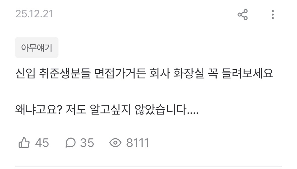 작성자너어는어쩜귀도수제비귀야 작성시간 26.03.01 대표만 남자고 나머지는 여자들인 개좃소 다니는데 화장실 한칸이거든 실장이 대표님도 쓰는데 화장실 깔끔히 쓰라며 잔소리.. 겨울에 개춥고 엄청 더럽게 쓴 것도 아님