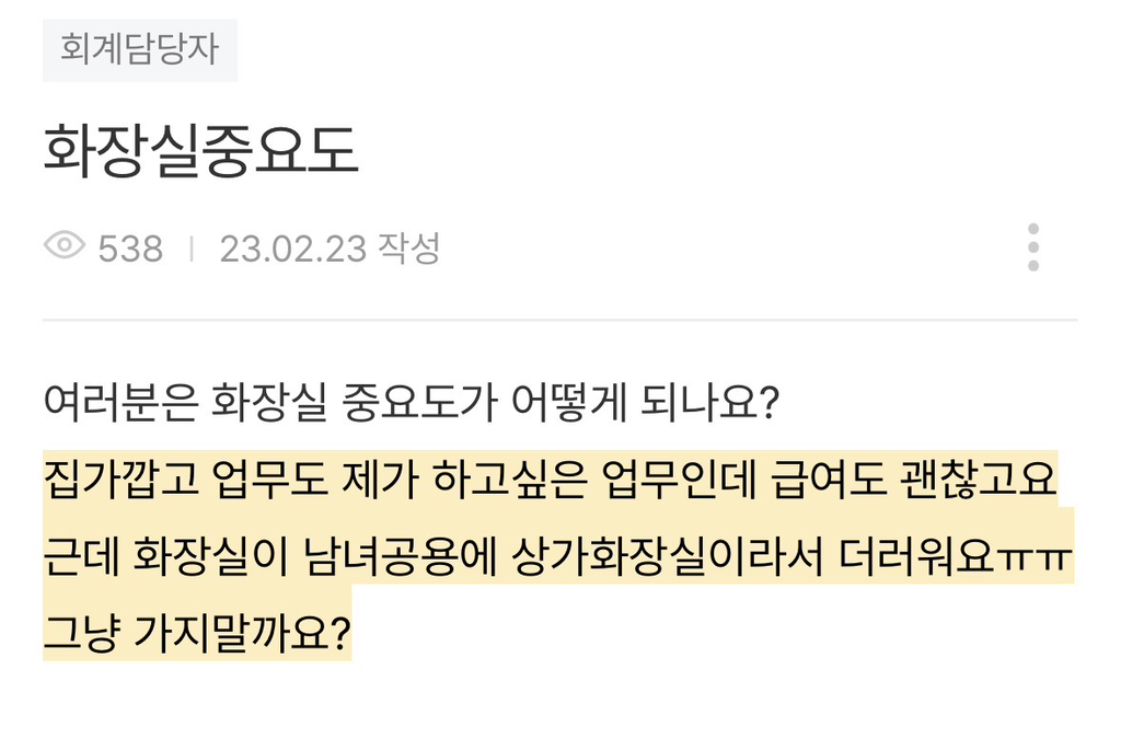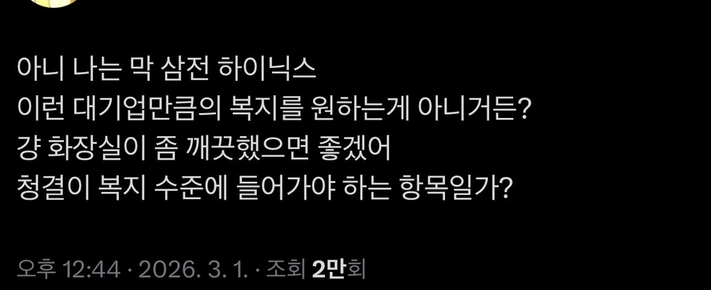 작성자반달곰곰이생각회 작성시간 26.03.01 아 ㄹㅇ 화장실이 회사 복지의 근본같음...진짜로