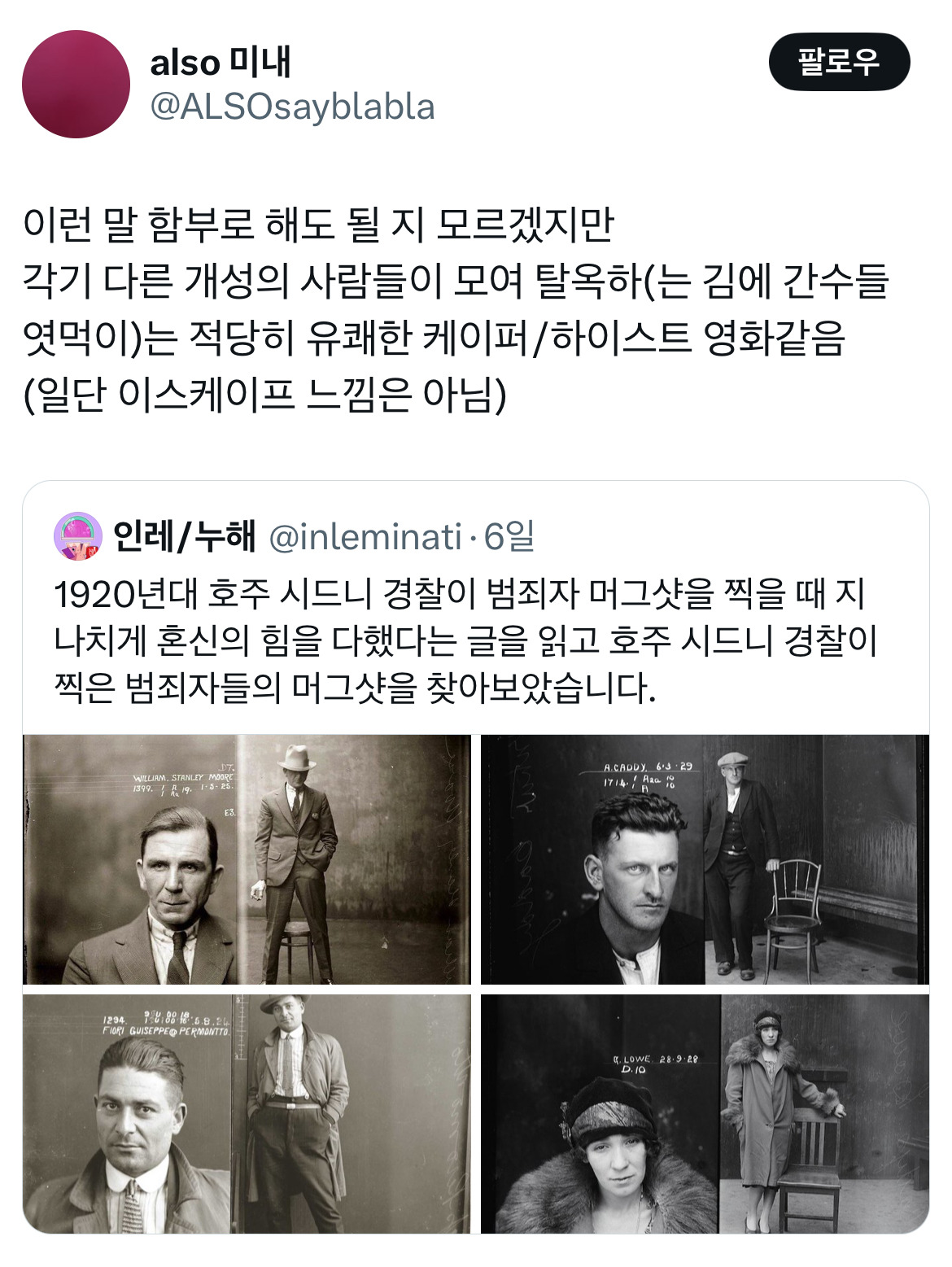 [스크랩] [흥미돋]1920년대 호주 시드니 경찰은 범죄자 머그샷을 찍을 때 지나치게 혼신의 힘을 다했다.twt 작성자Egypt|작성시간26.03.01|조회수27,308 목록 댓글 11 글자크기 작게가 글자크기 크게가 출처: https://x.com/inleminati/status/1967813893427958220?s=46 다음검색 스크랩 원문 : *여성시대* 차분한 20대들의 알흠다운 공간 현재 게시글 추가 기능 열기 북마크 공유하기 신고 센터로 신고 댓글 댓글 11 댓글쓰기 답글쓰기 댓글 리스트 작성자우렌지 | 작성시간 26.03.01 인생샷을 찍어줬어 작성자너살아있어그냥 | 작성시간 26.03.01 지랄났네 ㅋㅋㅋㅋㅋㅋㅌㅌ 작성자땃쥐G | 작성시간 26.03.01 공짜 사진관 작성자혼글 | 작성시간 26.03.02 이직포폴이래 개웃겨 작성자투비컨티뉴우우 | 작성시간 26.03.02 대박 나도 찍어줘 댓글 전체보기