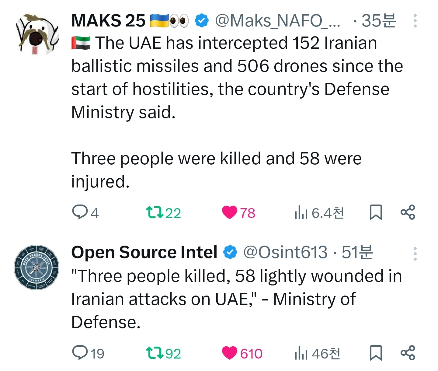 [스크랩] [기타]전쟁 발발 직후부터 오늘까지 UAE의 피해 집계 작성자아흐레|작성시간26.03.01|조회수24,394 목록 댓글 5 글자크기 작게가 글자크기 크게가 이란이 UAE에게 발사한 것들- 미사일 152발- 샤헤드 자폭드론 506대사상자- 3명 사망 58명 부상 다음검색 스크랩 원문 : 도탁스 (DOTAX) 현재 게시글 추가 기능 열기 북마크 공유하기 신고 센터로 신고 댓글 댓글 5 댓글쓰기 답글쓰기 댓글 리스트 작성자판 깨 | 작성시간 26.03.01 이란 ㄹㅇ 왜 두바이에 급발진함..;; 이스라엘이랑 싸워 샤갈... 작성자흐터진나날들 | 작성시간 26.03.01 발사한 거에 비해 사람들 덜 죽어서 다행이라 해야하나.. 작성자이응이응미음 | 작성시간 26.03.01 그래도 uae 방어체계가 잘되어있었나보다 ㅜ 작성자아치그레이 | 작성시간 26.03.02 근데 아랍에미리트가 뭔잘못…? 답댓글 작성자아주그냥김장년 | 작성시간 26.03.02 미군기지있대 ㅜ 댓글 전체보기