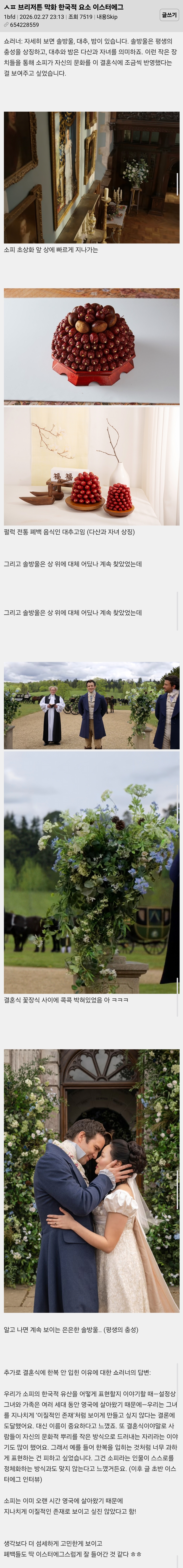작성자가니디 작성시간 26.03.02 브리저튼이 매 시즌 볼때마다 기승전결이 매끄럽진 못하고 늘 결말이 성급하다고 느끼는편이긴한데 이런 세부 설정들이 진짜 깜찍해서 매번 보게되는거같음