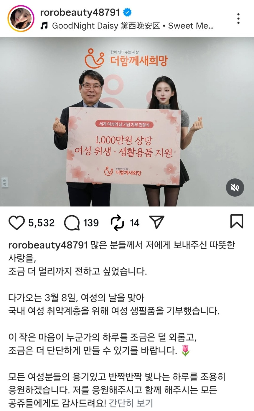 [흥미돋]트위터 '살림하는 도로로' 여성 취약계층에 1천만원 기부 작성자도로뇽용|작성시간26.03.01|조회수42,238 목록 댓글 85 글자크기 작게가 글자크기 크게가 출처: https://www.instagram.com/p/DVV1ClRgeBw/ (로로정식으로 유명한 그 사람 맞아)여성의 날을 맞아 여성 취약계층에 1천만원 기부 다음검색 현재 게시글 추가 기능 열기 북마크 공유하기 신고 센터로 신고 댓글 댓글 85 댓글쓰기 답글쓰기 댓글 리스트 작성자진규장 | 작성시간 26.03.02 멋진 개구리 로로 작성자두루밋 | 작성시간 26.03.02 멋진여성ㅠㅠ 작성자레어닉네임찾기 | 작성시간 26.03.02 멋지다 작성자치왈왈왈 | 작성시간 26.03.03 진짜 멋있어 작성자HOT TO GO | 작성시간 26.03.03 로로 대단해ㅜㅜ 댓글 전체보기