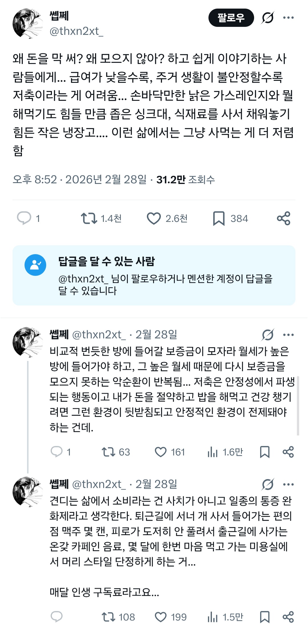 작성자이홍아래 작성시간 26.03.02 근데 그거 느꼈어 모아둔 돈 없으면 더 비싼값을 치루게 된다는거.. 냉장고 세탁기 같은거 당장 고장나면 사야되는데 카드할부조차 부담스러운 사람들은 월32,000원씩 내는 렌트가 더 저렴하게 느껴지잖아 근데 따지고보면 렌트가 훨 비쌈