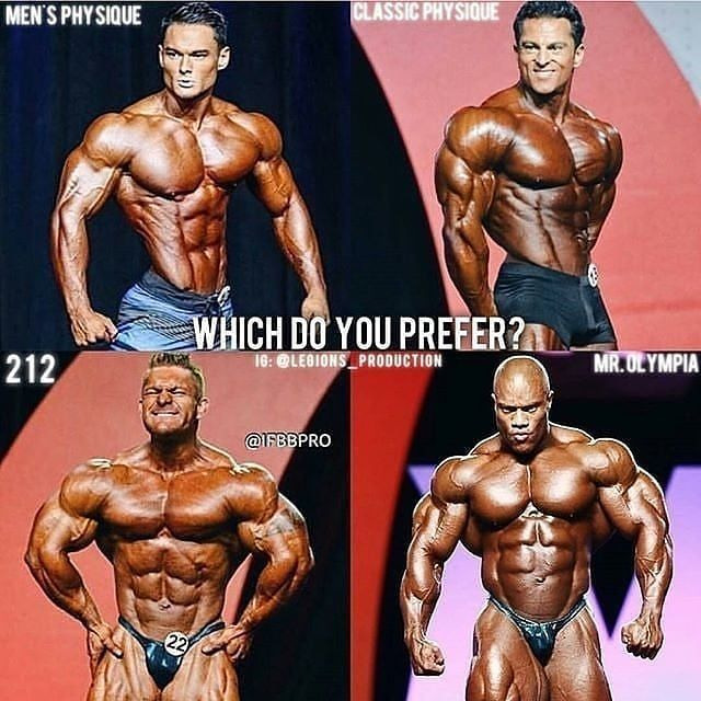 왼쪽 상단부터 맨즈피지크 / 클래식 피지크 / 212 보디빌딩 / 오픈 보디빌딩으로 나뉨