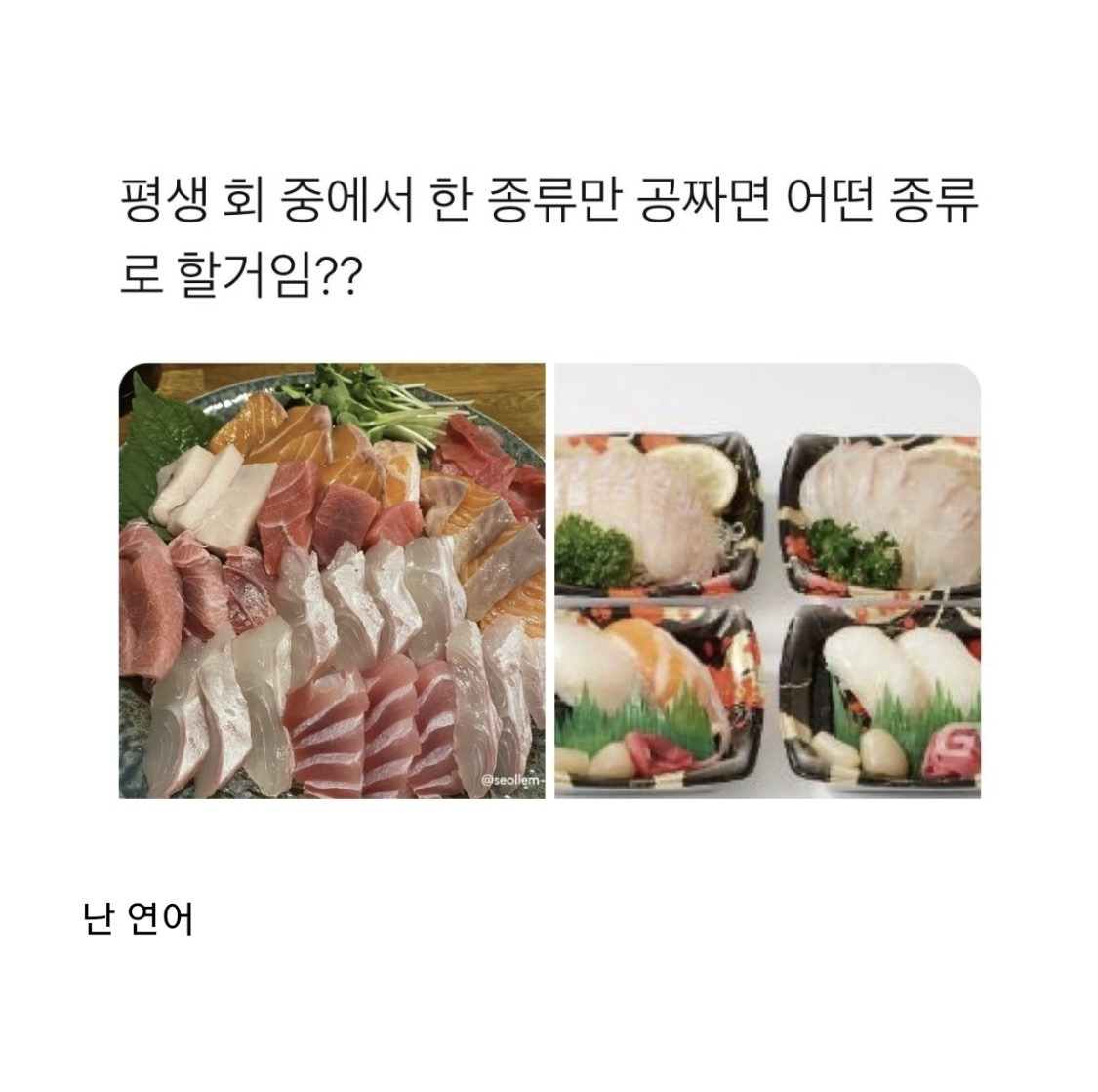 [흥미돋]평생 회 중에서 한 종류만 공짜면 어떤 종류로 할거임? 작성자솔란나|작성시간26.03.02|조회수29,822 목록 댓글 255 글자크기 작게가 글자크기 크게가 출처: https://www.dmitory.com/issue/402056186도다리회 다음검색 현재 게시글 추가 기능 열기 북마크 공유하기 신고 센터로 신고 댓글 댓글 255 댓글쓰기 답글쓰기 댓글 리스트 작성자인간캣닢 | 작성시간 26.03.03 대광어 작성자((본인닉네임) | 작성시간 26.03.03 밀치 작성자로웨나래번클로 | 작성시간 26.03.04 오징어 작성자나야나_ | 작성시간 26.03.05 밀치 작성자럽욜셆 | 작성시간 26.03.08 아 고민된다... 내가 좋아하는건 광어 연어 농어 방어 인데....... 연어로 가겠슴다.... 회로도 먹고 구워도 먹고 연어장으로도 먹고 하면 다른거 보다 덜 질릴듯 댓글 전체보기