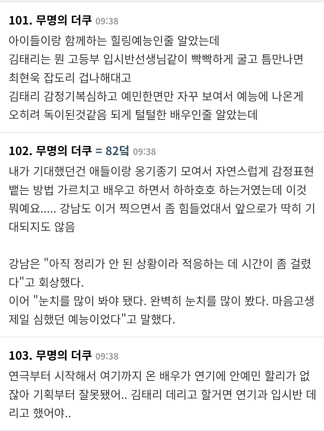 작성자너없인안된다 작성시간 26.03.02 힐링일줄 알았는데 기빨려ㅠ 남배는 넘 싫고 태리는 너무 징징대는 톤이 듣기 싫어ㅠㅠ