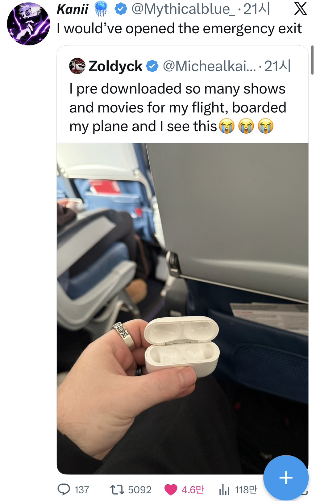 [흥미돋]쌰갈 비행기 안에서 보려고 드라마랑 영화 엄청 많이 낉여놨는데 이륙하고 내가 본 거 작성자여자둘이상무조건엮음|작성시간26.03.02|조회수85,722 목록 댓글 37 글자크기 작게가 글자크기 크게가 출처: https://x.com/mythicalblue_/status/2027785685101645987?s=46X의 𝙆𝙖𝙣𝙞𝙞 🪼님(@Mythicalblue_)I would’ve opened the emergency exitx.com나라면 비상탈출구 열었을 거야 다음검색 현재 게시글 추가 기능 열기 북마크 공유하기 신고 센터로 신고 댓글 댓글 37 댓글쓰기 답글쓰기 댓글 리스트 답댓글 작성자누구스 | 작성시간 26.03.02 티모시살라메 아 그러네 3.5잭으로 주지 참 작성자사직로 161 | 작성시간 26.03.02 난 가끔 자막만 보기도하는뎈ㅋㅋㅋㅋㅋ 잉부러… 귀나빠질까봐 안들어걍 작성자클로로_루실후르 | 작성시간 26.03.02 나 그래서 꼭 줄이어폰도 같이 가져가... 작성자Amoroso | 작성시간 26.03.02 앜 어쩌다ㅠㅠㅠ 작성자메숍 | 작성시간 26.03.02 공항편의점에서 유선이어폰산적있음ㅜㅜ 댓글 전체보기