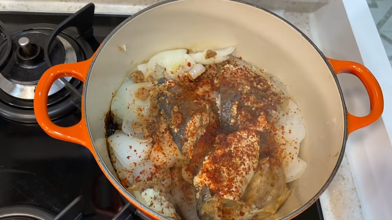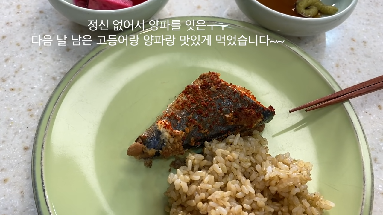- 고등어 양파 조림 (양파 깔고 고등어에 다진 마늘, 간장, 고춧가루, 된장 발라서)