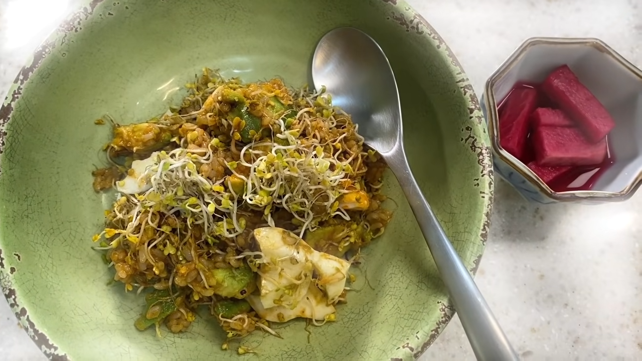 - 현미밥, 새싹채소, 삶은계란 1개, 아보카도 반 개
