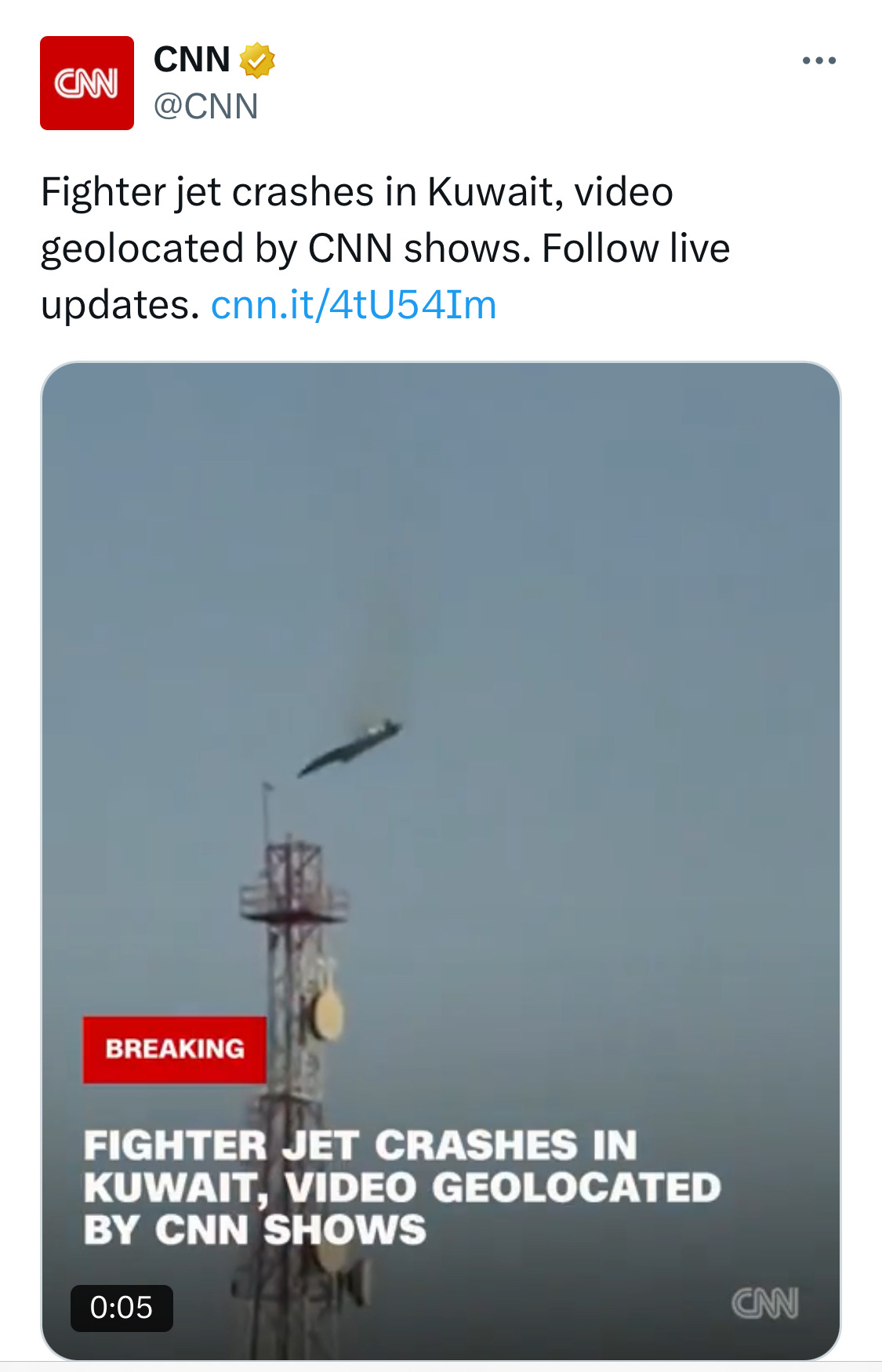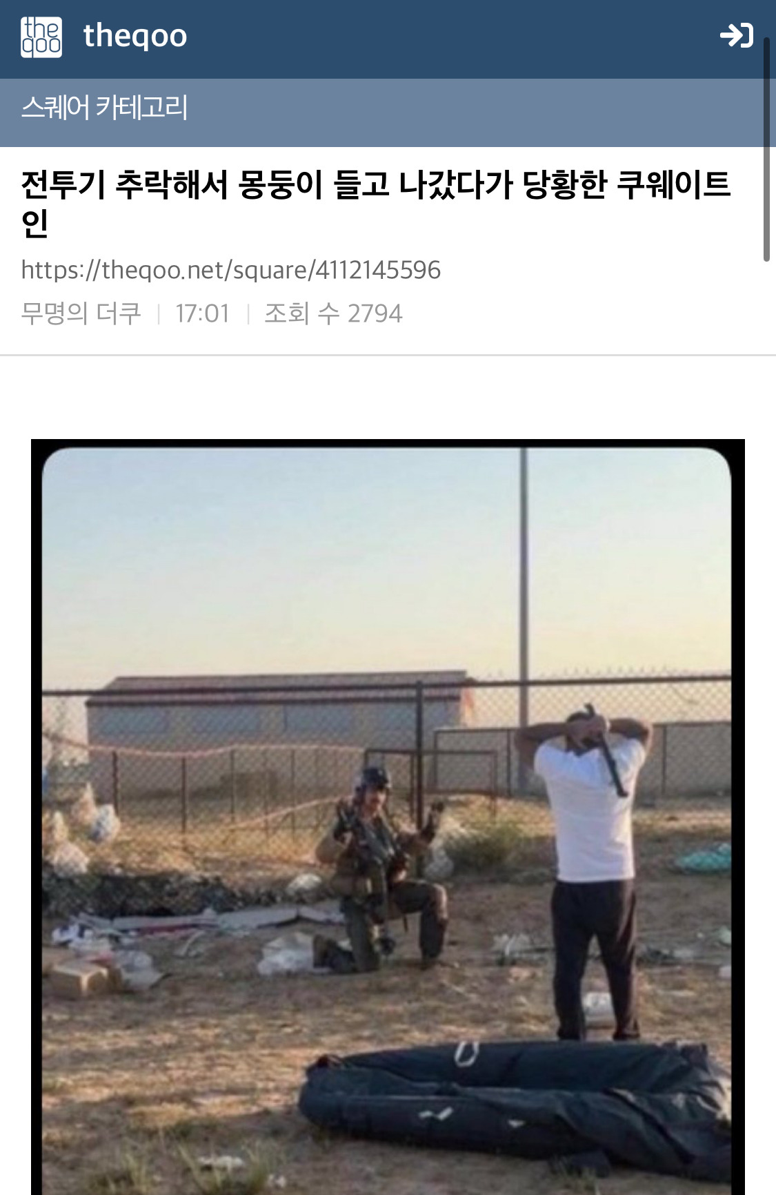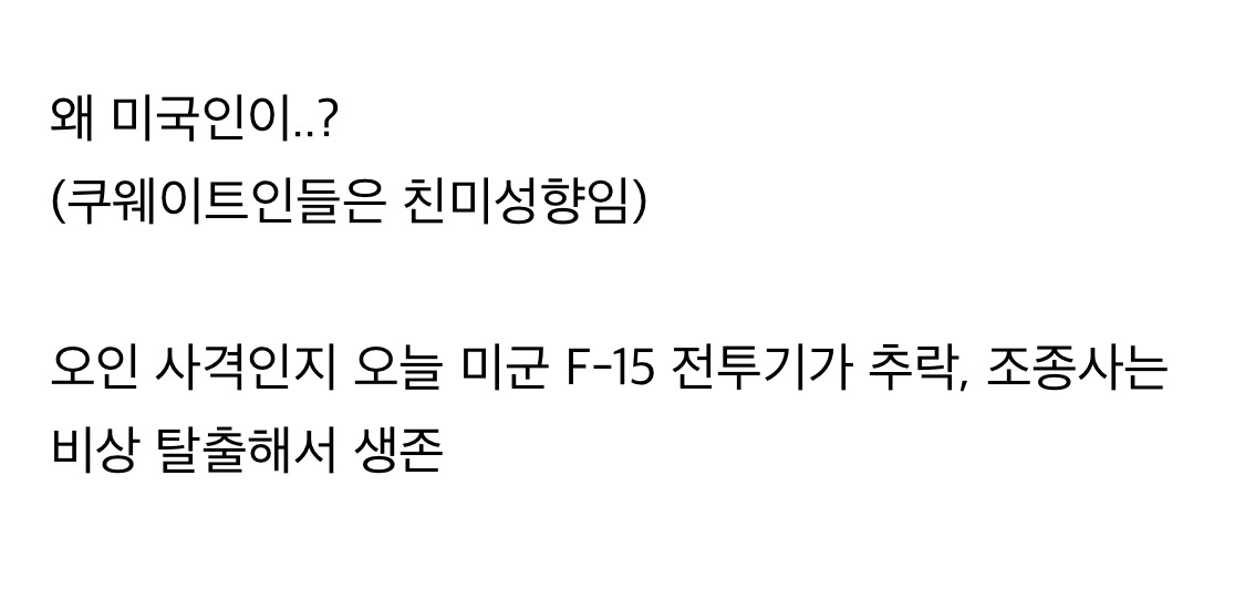 [기타]쿠웨이트 국방부 "미군 전투기 여러 대 추락“ 작성자(본인닉네임).|작성시간26.03.02|조회수10,833 목록 댓글 3 글자크기 작게가 글자크기 크게가 출처: https://x.com/CNN/status/2028362597876085117출처https://theqoo.net/square/4112145596?filter_mode=normal&page=3 다음검색 현재 게시글 추가 기능 열기 북마크 공유하기 신고 센터로 신고 댓글 댓글 3 댓글쓰기 답글쓰기 댓글 리스트 작성자헤그리 | 작성시간 26.03.02 오인사격인가? 작성자냥냥냥컴온 | 작성시간 26.03.02 몽둥이.. 아놔 작성자난무민이좋아 | 작성시간 26.03.02 아이고 조종사 살아서 다행 댓글 전체보기