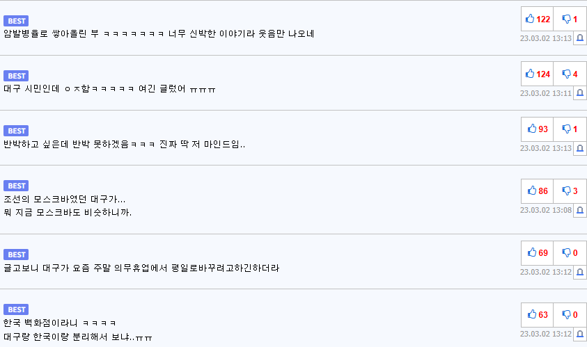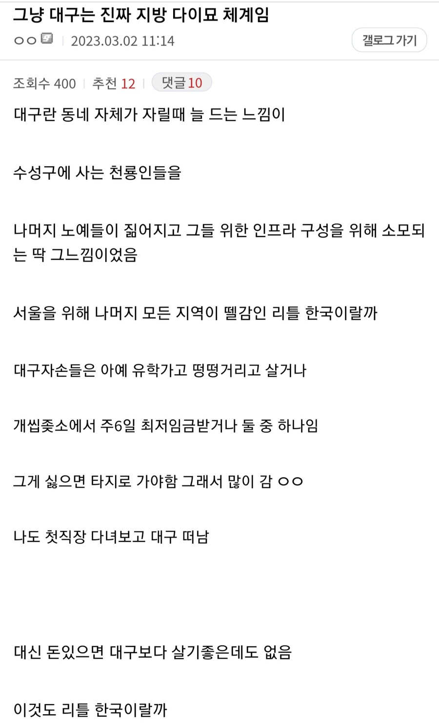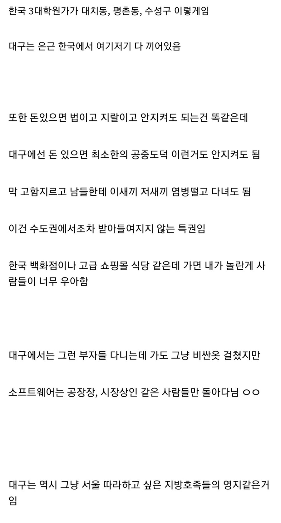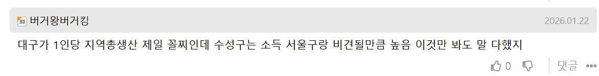 작성자팡팡콩팡퐁 작성시간 26.03.03 대구가 소비도시인것도 저 이유인듯. 인근 주변 지역에서 돈 벌어서 대구와서 씀. 돈 벌기는 어렵고 쓸 곳은 많고..