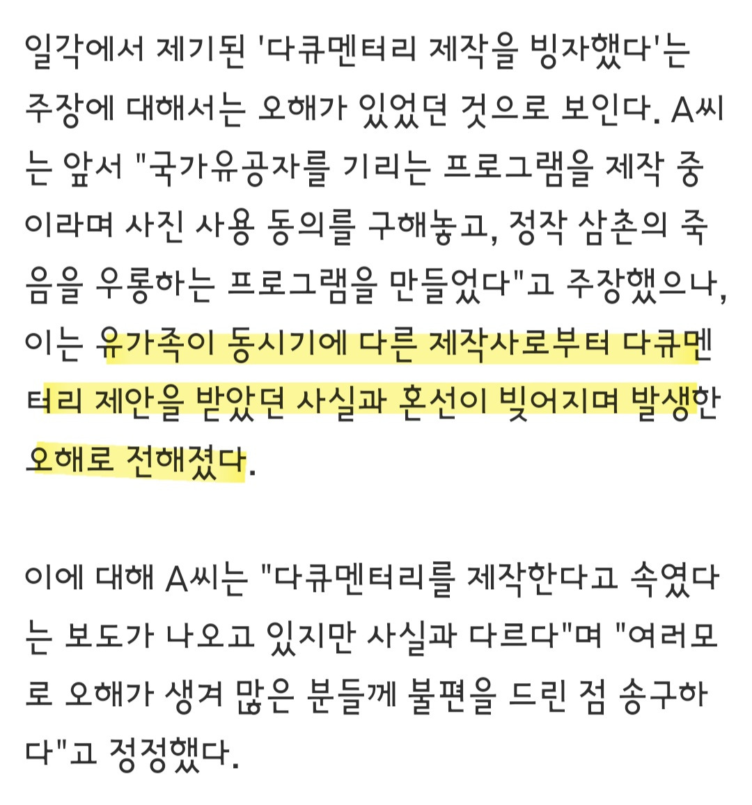 일각에서 제기된 '다큐멘터리 제작을 빙자했다'는 주장에 대해서는 오해가 있었던 것으로 보인다. A씨는 앞서 "국가유공자를 기리는 프로그램을 제작 중이라며 사진 사용 동의를 구해놓고, 정작 삼촌의 죽음을 우롱하는 프로그램을 만들었다"고 주장했으나, 이는 유가족이 동시기에 다른 제작사로부터 다큐멘터리 제안을 받았던 사실과 혼선이 빚어지며 발생한 오해로 전해졌다.