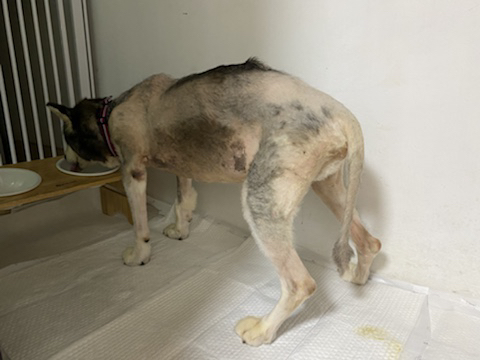위탁처에서 지나던 바라미가 어느날 갑자기 못걷게 되었어. 6/23까지 봉사자님들과 산책도 잘 했는데 3일만에 주저 앉아서 못걷게 된거야
