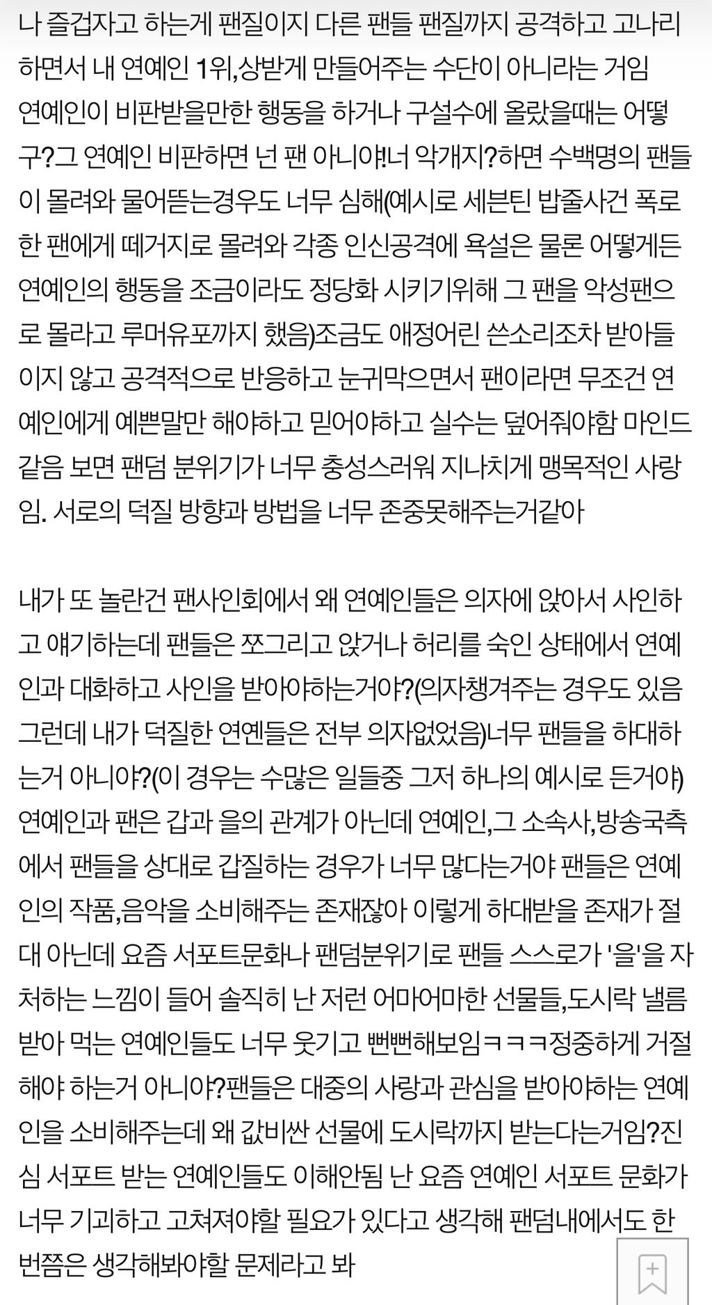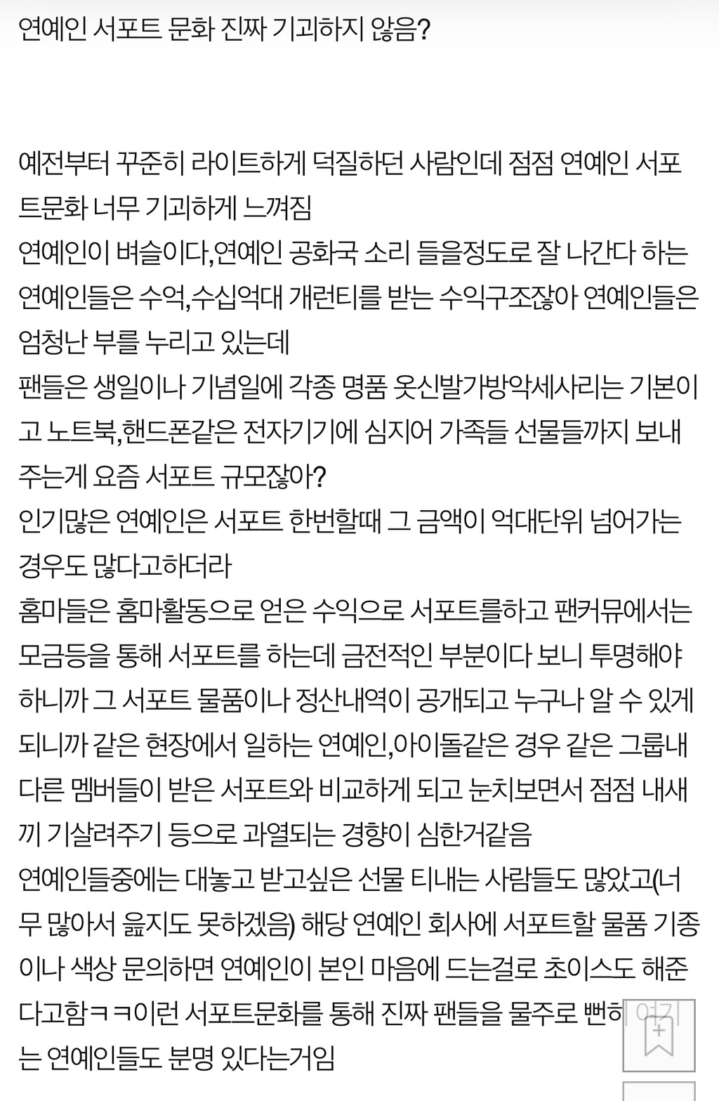 [스크랩] [흥미돋]연예인 서포트 문화 진짜 기괴하지 않음? .Pann 작성자잠.홍|작성시간26.03.03|조회수13,325 목록 댓글 18 글자크기 작게가 글자크기 크게가 출처: https://m.pann.nate.com/talk/339856133 다음검색 스크랩 원문 : *여성시대* 차분한 20대들의 알흠다운 공간 현재 게시글 추가 기능 열기 북마크 공유하기 신고 센터로 신고 댓글 댓글 18 댓글쓰기 답글쓰기 댓글 리스트 작성자다끝시안데 | 작성시간 26.03.03 ㄹㅇ 이백억집있어도 받는거 신기 작성자완자퀸카 | 작성시간 26.03.03 그걸 받아서 인증하는 연예인들도 별로임 작성자양말좋아 | 작성시간 26.03.03 왜 이렇게 갖다 바치는 걸 좋아하지? 서포트는 더 가진 사람들이 지원해주는 거 아닌가현생사십쇼 작성자레즈비언어쌔신 | 작성시간 26.03.03 차라리 연옌 이름으로 기부를 해 작성자주민진 | 작성시간 26.03.03 ㅈㄴ 기기괴괴.... 댓글 전체보기