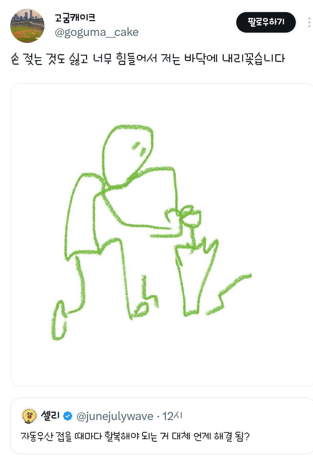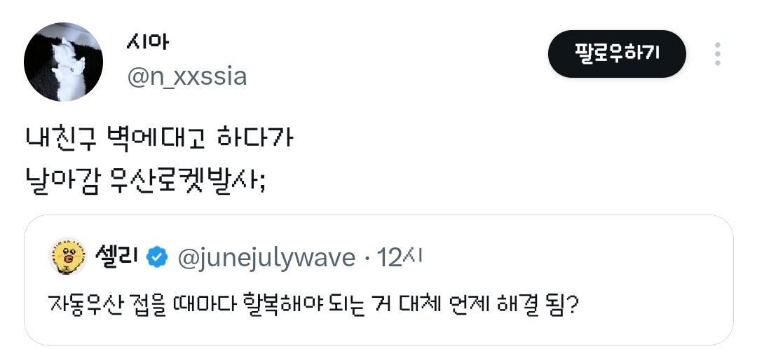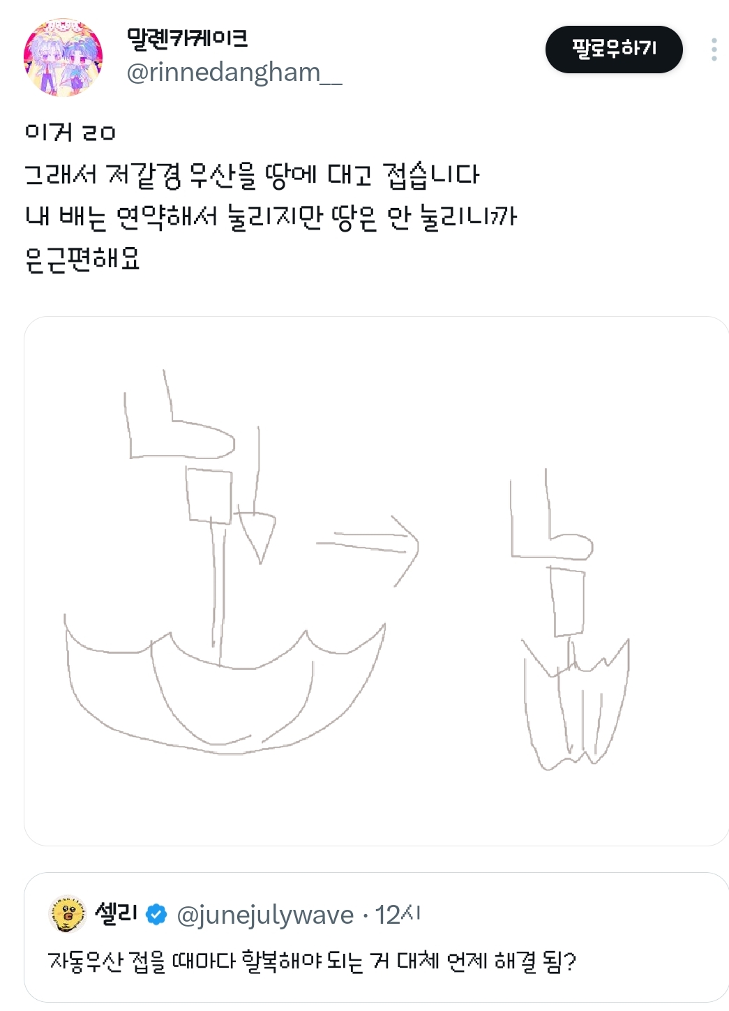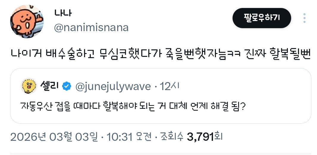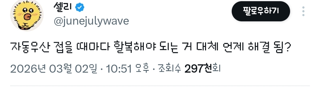 [흥미돋]자동우산 접을 때마다 할복해야 되는 거 대체 언제 해결 됨?.twt 작성자방울|작성시간26.03.03|조회수90,201 목록 댓글 255 글자크기 작게가 글자크기 크게가 출처: 여성시대 방울https://x.com/junejulywave/status/2028468288955834531?t=QQNxWmVN77YB5jTy8pIUkA&s=19어제도 할복을 몇번이나 했는지 원 다음검색 현재 게시글 추가 기능 열기 북마크 공유하기 신고 센터로 신고 댓글 댓글 255 댓글쓰기 답글쓰기 댓글 리스트 작성자푸데데 | 작성시간 26.03.04 new 시히히히히바 작성자똑바로 살아라 | 작성시간 26.03.04 new 할복ㅋㅋㅋㅋㅋㅋ 작성자새벽바람 | 작성시간 26.03.04 new 개웃곀ㅋㅋㅋㅋㅋㅋ 작성자면빵밥죽떡 | 작성시간 26.03.04 new 표현 할복 ㅋㅋㅋㅋㅋㅋㅋㅋㅋ 작성자Han Kang | 작성시간 26.03.04 new ㅋㅋㅋㅋㅋㅋㅋㅋㅋ할복이란 말이 ㅈㄴ웃김 댓글 전체보기