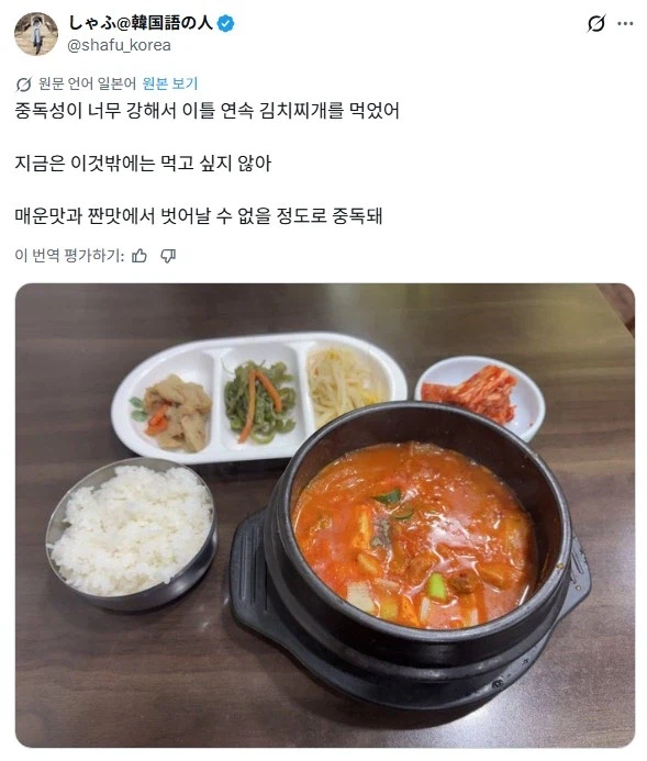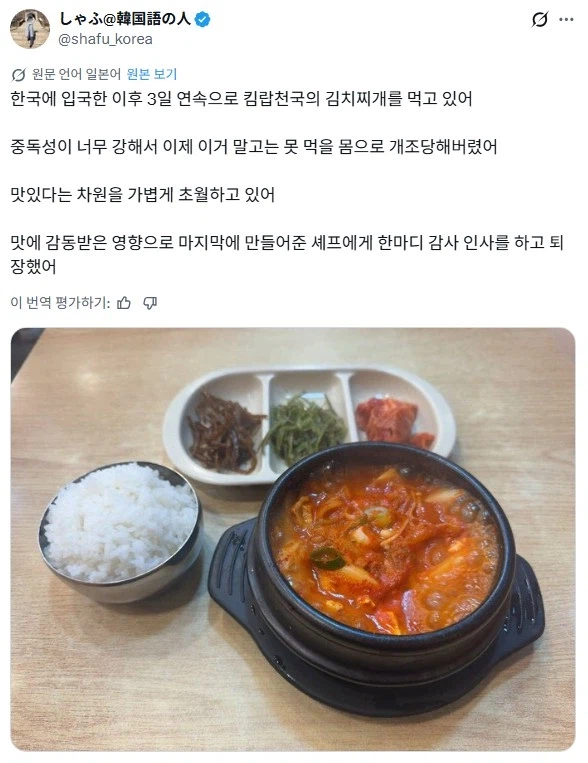 [흥미돋]일본인 유학생이 한국 입국 후 4일 내내 먹은 것 작성자Oasis|작성시간26.03.03|조회수13,362 목록 댓글 29 글자크기 작게가 글자크기 크게가 출처: https://x.com/i/status/2028454279208698061X의 しゃふ@韓国語の人님(@shafu_korea)私が留学初日から4日連続でキムチチゲを食べた話が現地のコミュニティで話題になったらしい 韓国の方に拡散されて自分の投稿がひとり歩きした結果、海外まで流れ着いてしまった 共感やx.com김밥천국의 김치찌개 다음검색 현재 게시글 추가 기능 열기 북마크 공유하기 신고 센터로 신고 댓글 댓글 29 댓글쓰기 답글쓰기 댓글 리스트 작성자아인 | 작성시간 26.03.03 나도 참치김치찌개 중독된적있어서 이해함 작성자강죠지 | 작성시간 26.03.03 셰프한테 인사하고 떠났다는게 개웃곀ㅋㅋㅋㅋㅋㅋㅋㅋㅋ 작성자T쌉T인팁T | 작성시간 26.03.03 킴랍천국 킴부천국 ㅋㅋㅋㅋㅋㅋㅋㅋㅋㅋㅋㅋㅋㅋㅋㅋ 작성자푸라닭투움바 | 작성시간 26.03.03 말투가 너무 일본인의 그것이라 웃김 작성자애 교 재 명 | 작성시간 26.03.05 이사람 일주일 내내 먹엇던뎈ㅋㅋㅋ 댓글 전체보기