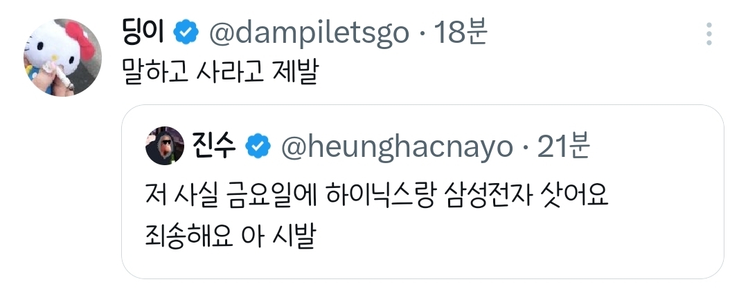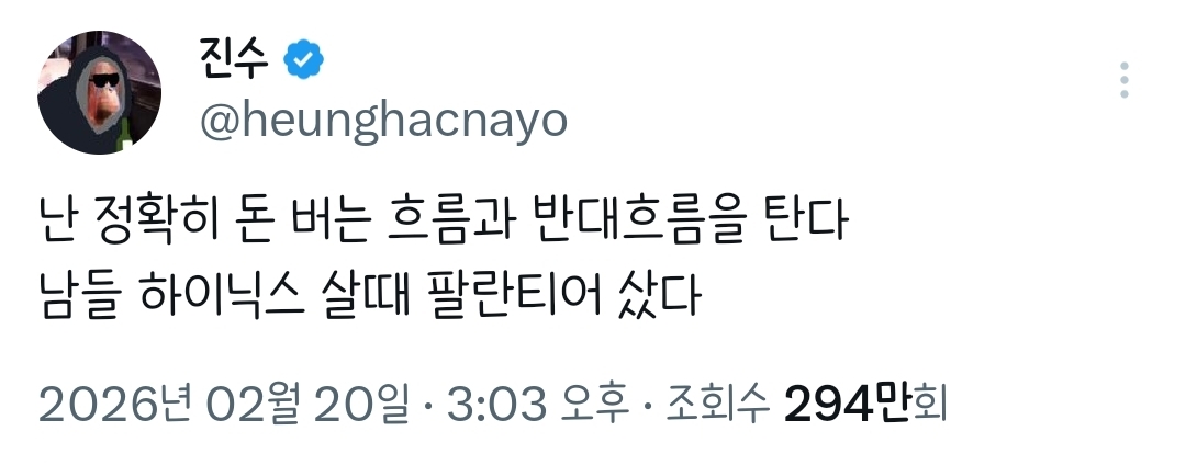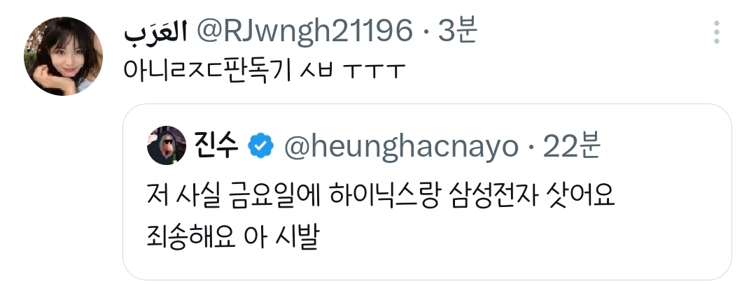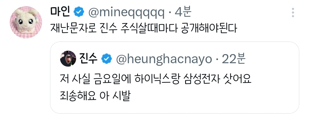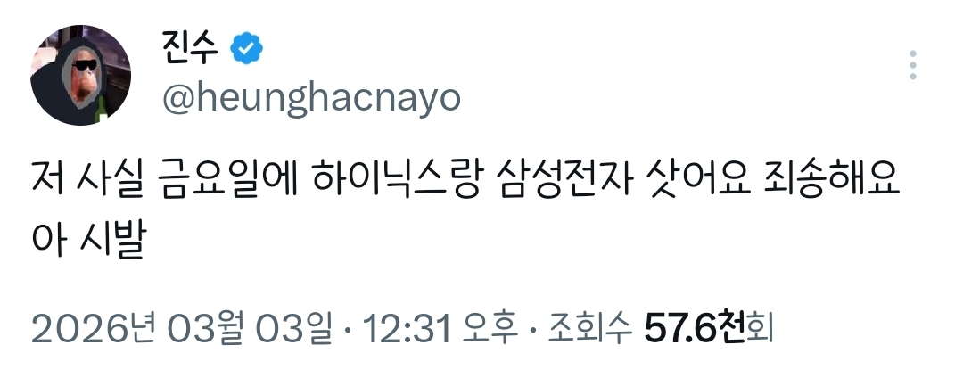 [흥미돋]저 사실 금요일에 하이닉스랑 삼성전자 삿어요.twt 작성자햐리뵤|작성시간26.03.03|조회수96,159 목록 댓글 257 글자크기 작게가 글자크기 크게가 출처: 여성시대 햐리뵤https://x.com/i/status/2028674512234144064X의 진수님(@heunghacnayo)저 사실 금요일에 하이닉스랑 삼성전자 삿어요 죄송해요 아 시발x.com진수의 전적 다음검색 현재 게시글 추가 기능 열기 북마크 공유하기 신고 센터로 신고 댓글 댓글 257 댓글쓰기 답글쓰기 댓글 리스트 작성자리욜으 | 작성시간 26.03.03 아 진수 ㅠㅠㅜ 작성자((본인닉네임) | 작성시간 26.03.03 너때문이구나 진수야 작성자1000hours | 작성시간 26.03.03 진수 ㅋㅋㅋㅋㅋㅋㅋㅋㅋ 작성자구도훈 | 작성시간 26.03.04 아미친ㅋㅋㅋㅋㅋㅋ 작성자괄괄이영지 | 작성시간 26.03.04 진수야악!!! 댓글 전체보기
