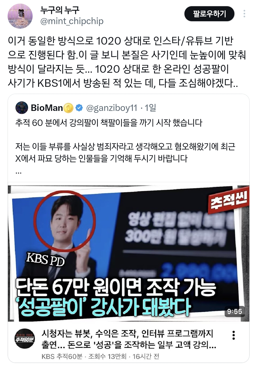 작성자6섯시내갋배 작성시간 26.03.04 별 시덥잖은 소리 하고 강의비 300 받고 이런놈들 짱 많음 강의 듣고 성공후기라고 데리고온 사람 1명이고ㅋㅋㄱㅋㅋ 그렇게 강의를 많이 했는데 1명이 말이되냐고ㅡㅡ 근데 결제하는 사람이 더러 있더라...