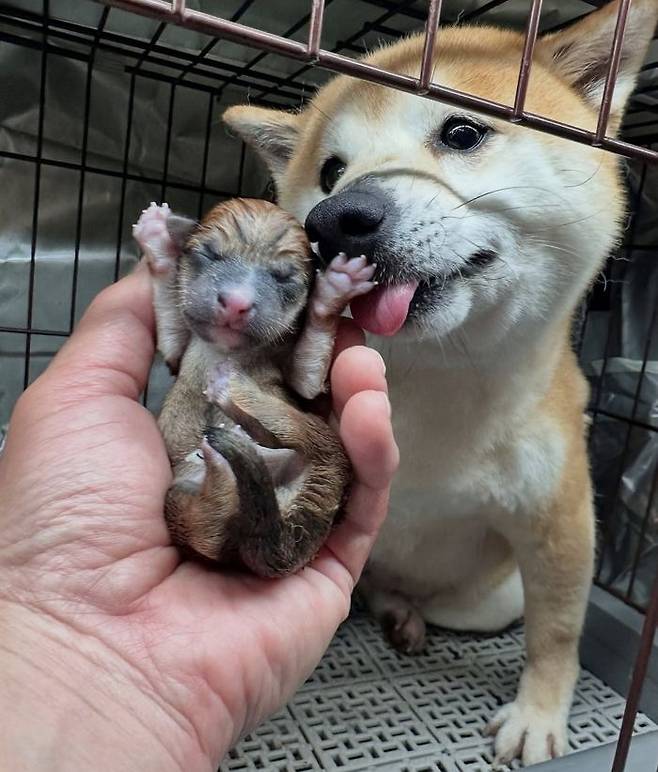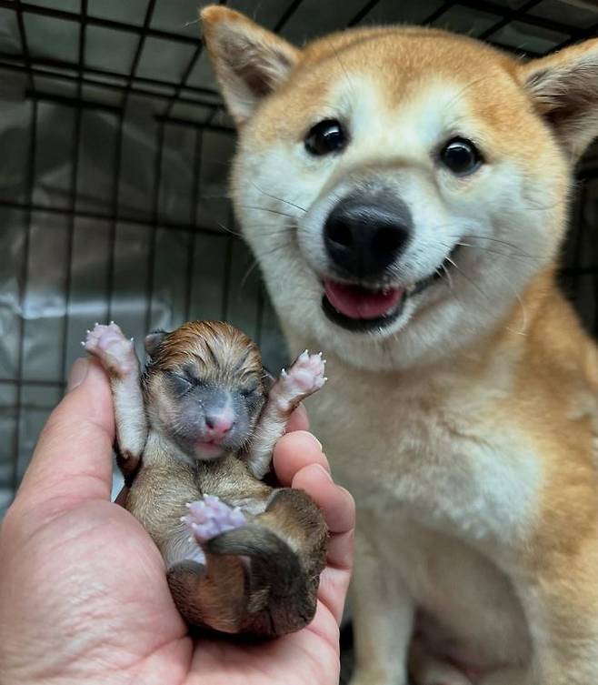 공개된 사진 속에는 이제 막 눈도 뜨지 못한 아주 작은 새끼 강아지를 조심스럽게 손바닥에 올린 주인의 모습과, 그 뒤에서 이를 흐뭇하게 바라보는 '엄마' 시바견의 모습이 담겨 있습니다.
