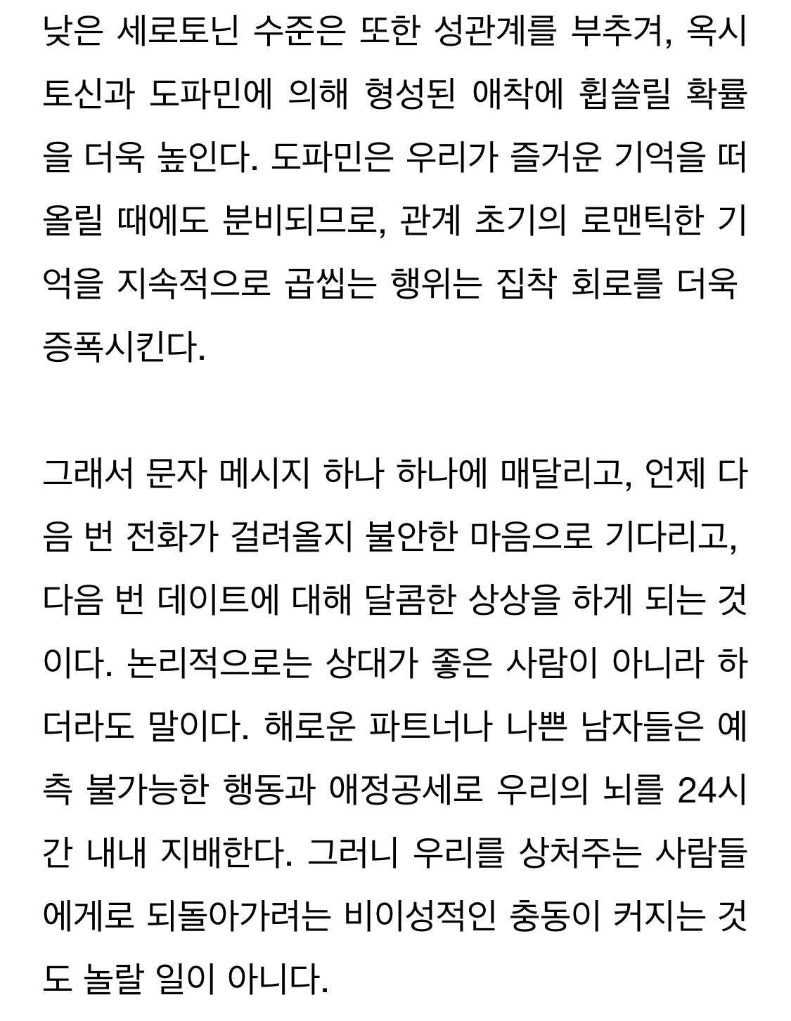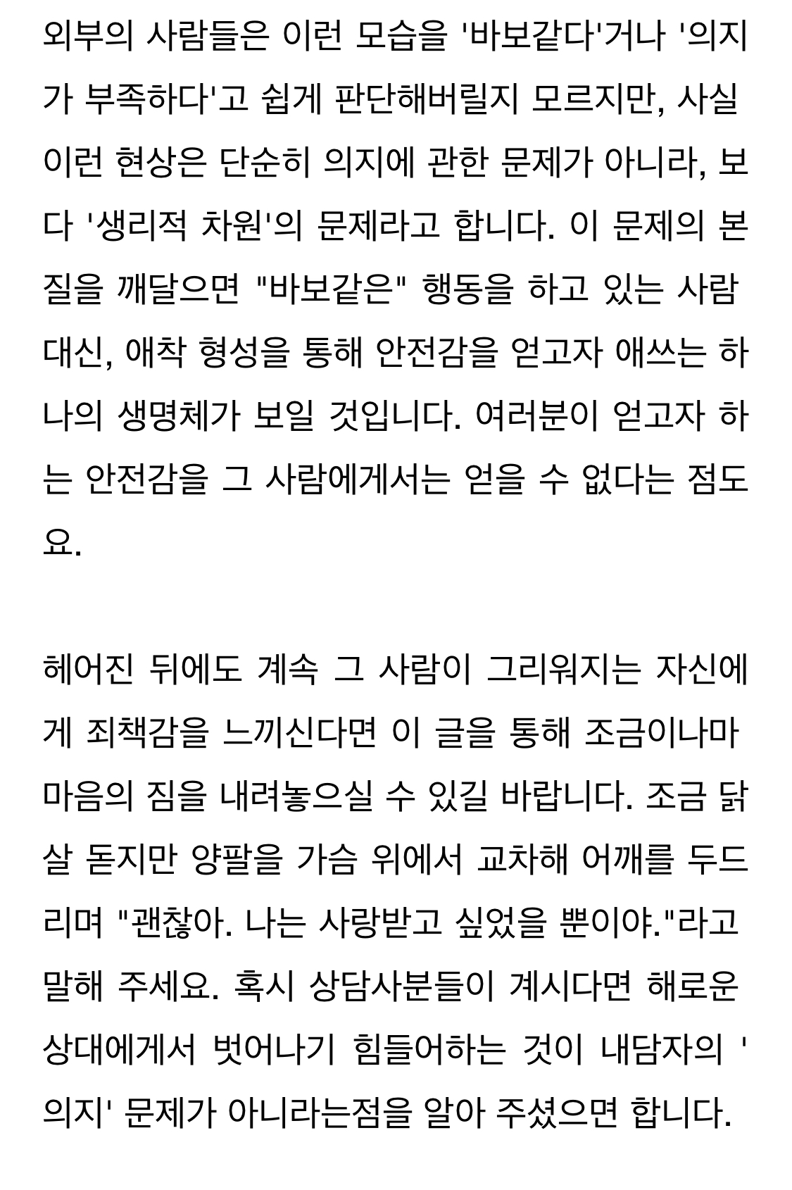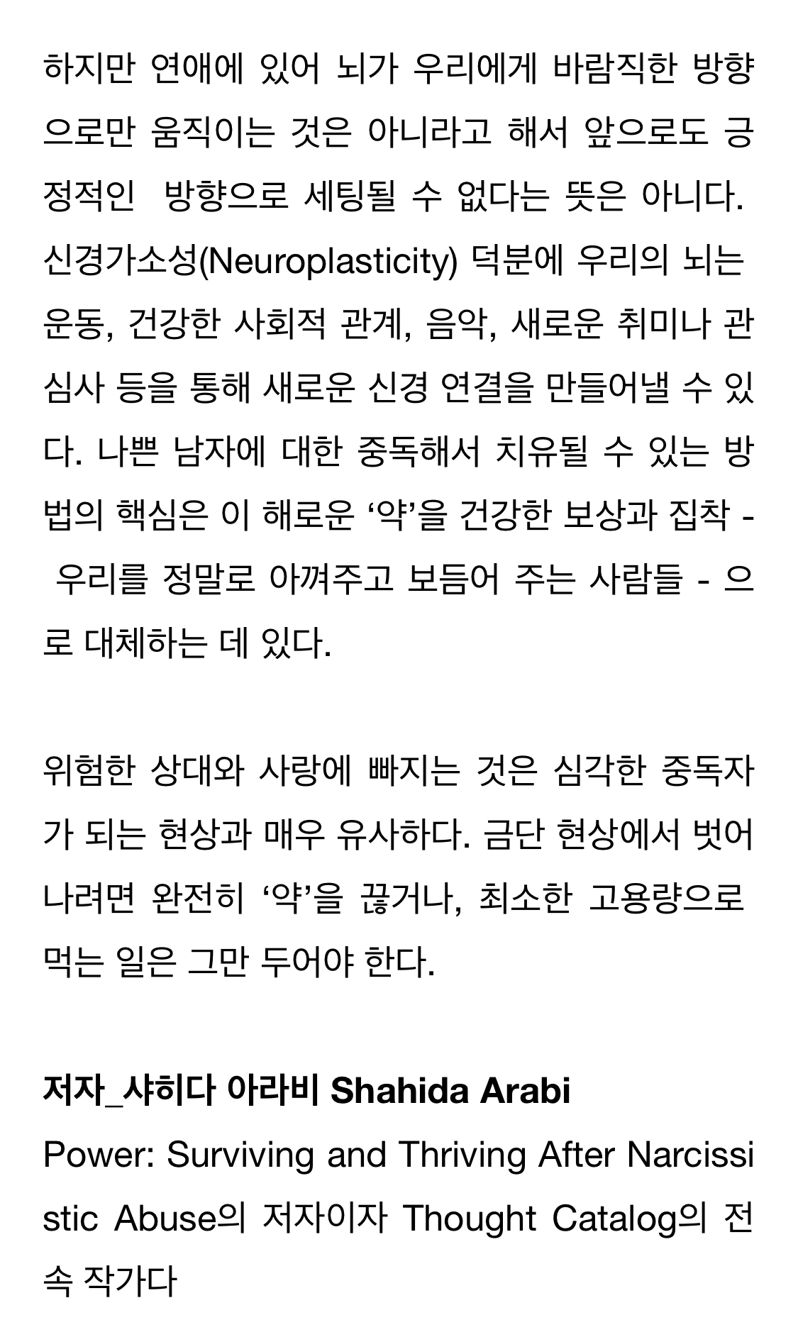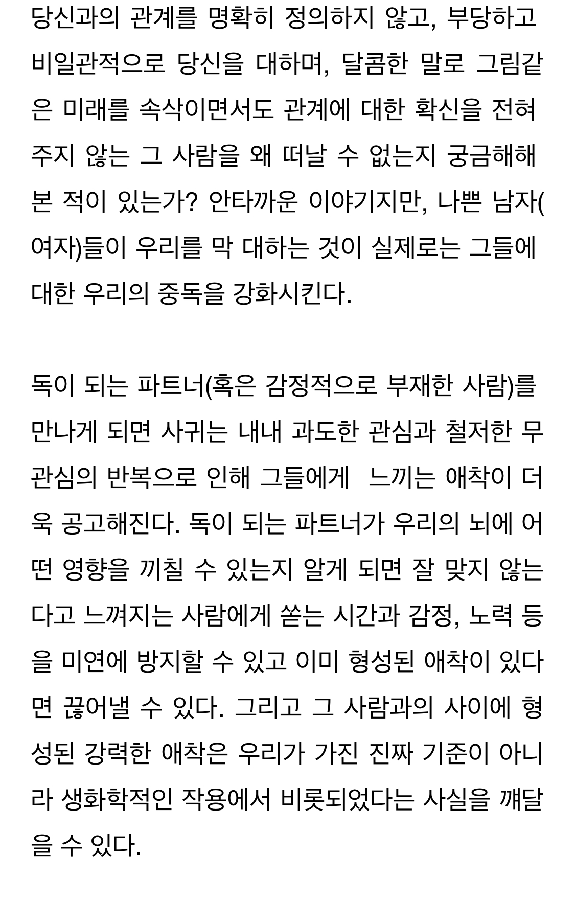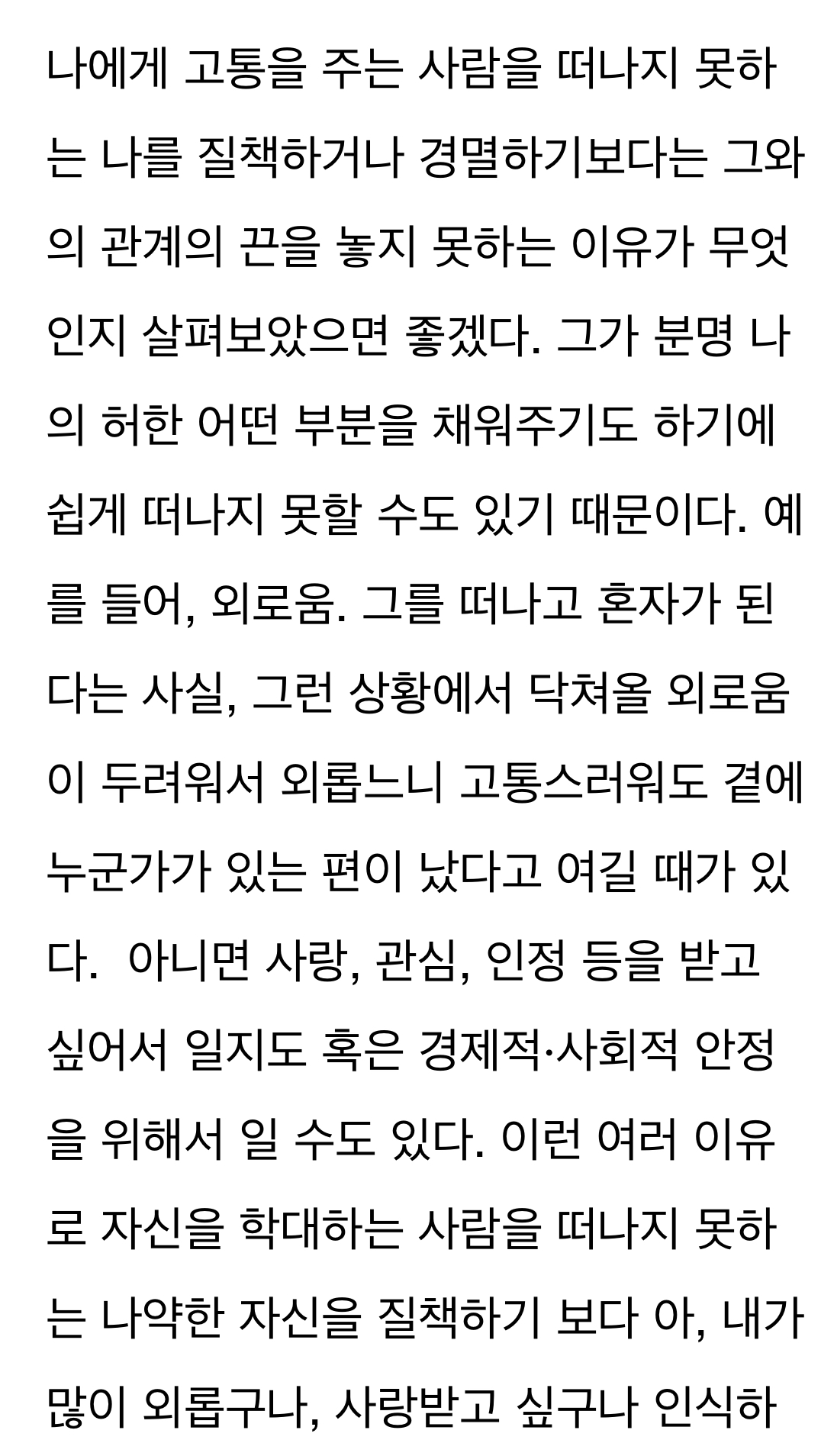 작성자솔피돌핀 작성시간 26.03.04 해로운 사람은 우리에게 필요란것을 주지 못하고 이는 우리로 하여굼 좋았던 시절에 목을 매고 계속해서 관계에 투자하게끔 만든다
