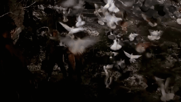 모이를 도둑들에게 던져 비둘기가 도둑을 공격하는 장면은