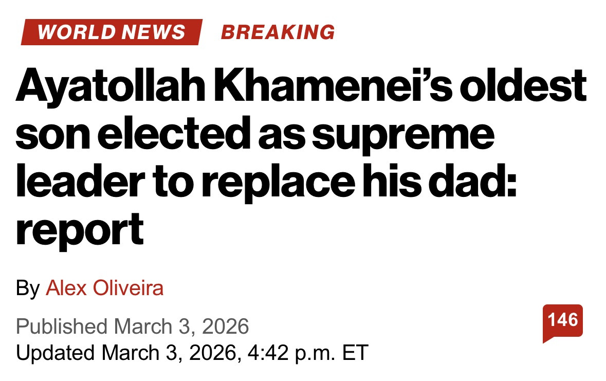 [흥미돋]새 이란 최고 지도자, 하메네이 아들 모즈타바 선정 작성자Sunmoonstar02|작성시간26.03.04|조회수35,769 목록 댓글 69 글자크기 작게가 글자크기 크게가 출처: https://nypost.com/2026/03/03/world-news/ayatollah-khameneis-oldest-son-elected-to-supreme-leader-to-replace-his-dad-report/하메네이 첫 아들이 이란의 새로운 최고 지도자로 선정됨 다음검색 현재 게시글 추가 기능 열기 북마크 공유하기 신고 센터로 신고 댓글 댓글 69 댓글쓰기 답글쓰기 댓글 리스트 작성자맹고스므듸 | 작성시간 26.03.04 곧 죽겠네 작성자에리애비 | 작성시간 26.03.04 곧 죽것네 ㅋㅋㅋㅋ 작성자둥지냉면 | 작성시간 26.03.04 곧 가겠네.. 작성자딸기티라미슈 | 작성시간 26.03.04 곧 죽겠네 작성자우오오올 | 작성시간 26.03.05 와 똑같이생겼네.. 얘 동정론도 나온대서 얼렁 뒤져야할듯,, 댓글 전체보기