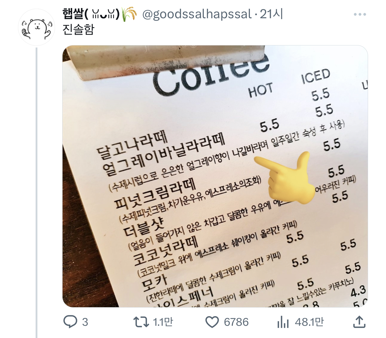 [스크랩] [흥미돋]은은한 얼그레이향이 나길바라며 얼그레이 바닐라라떼 작성자solulu|작성시간26.03.04|조회수15,735 목록 댓글 3 글자크기 작게가 글자크기 크게가 출처 : https://twitter.com/goodssalhapssal/status/1643521265582641152?s=46&t=v7QMmEln8v7WsADFKYn65g 다음검색 스크랩 원문 : *여성시대* 차분한 20대들의 알흠다운 공간 현재 게시글 추가 기능 열기 북마크 공유하기 신고 센터로 신고 댓글 댓글 3 댓글쓰기 답글쓰기 댓글 리스트 작성자핵부자 | 작성시간 26.03.04 솔직허네 작성자Overthinking | 작성시간 26.03.04 시키고 싶게 만드네 작성자LEE재명 | 작성시간 26.03.04 나길 바라며ㅋㅋㅋㅋㅋㅋ 댓글 전체보기