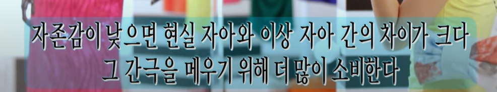 자존감이 낮을 수록 "이상적인 나"와의 간극이 멀게 느껴져 즉각적인 소비로 그 간극을 좁히고 싶어함.