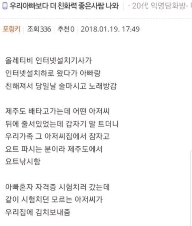 같이 워터파크가서 슬라이드기다리다가 내가 먼저 튜브 건네받아서 올라가는데 뒤돌아보니 슬라이드 알바생이 웃고잇고아빠가 스몰토크하고 올라오길래 뭔얘기했냐니까 밥은먹고일하고있냐고 물어봤다고.... 뭔가어른의 따수움이느껴졌다