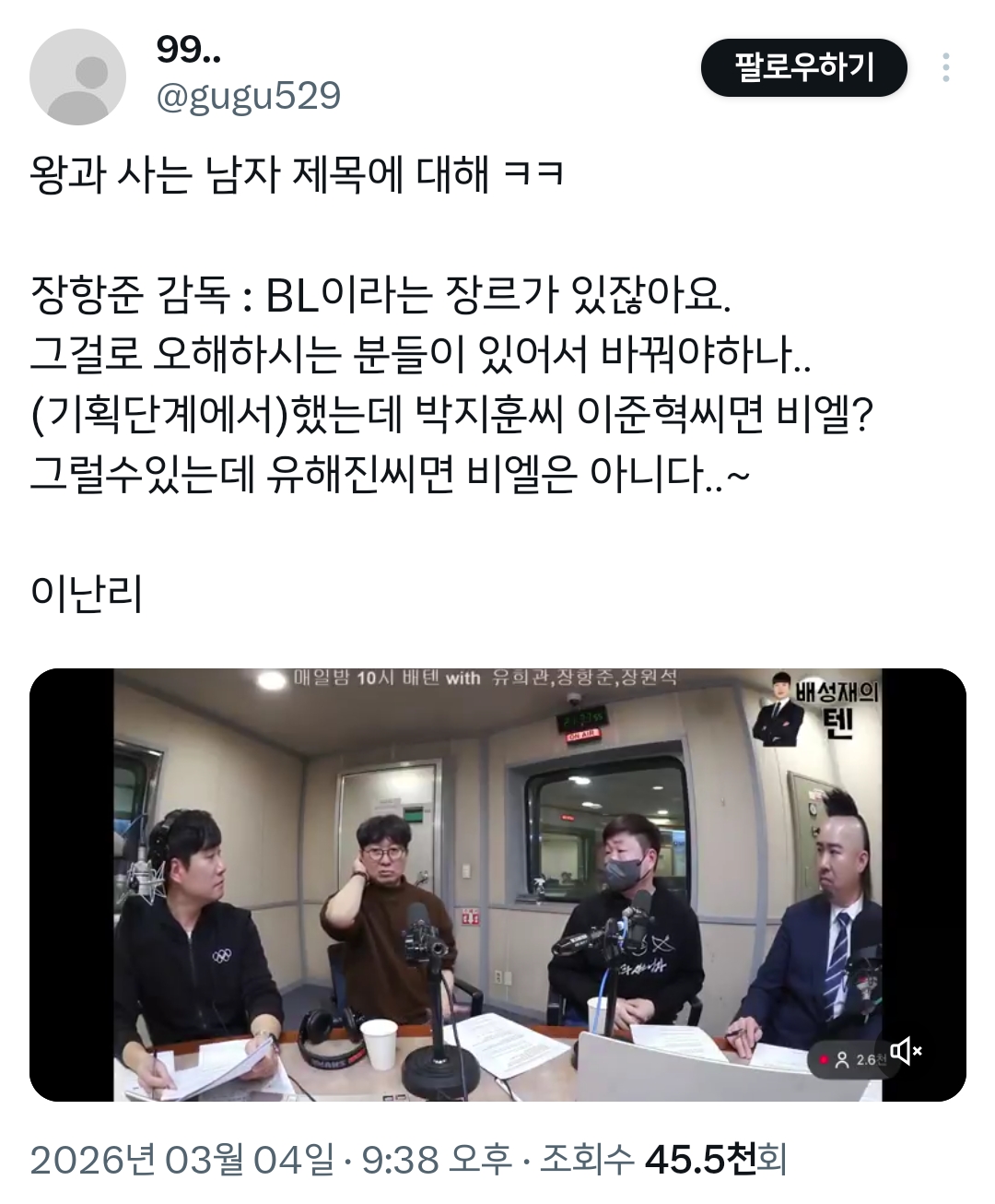 [스크랩] [흥미돋]왕과 사는 남자 제목에 대해: (기획단계에서)했는데 박지훈씨 이준혁씨면 비엘? 그럴수있는데 유해진씨면 비엘은 아니다.X 작성자아쿠아마린|작성시간26.03.04|조회수11,929 목록 댓글 9 글자크기 작게가 글자크기 크게가 출처 : https://x.com/i/status/2029174574563442770 다음검색 스크랩 원문 : 소주담(談) : 소소한 주민들의 이야기 현재 게시글 추가 기능 열기 북마크 공유하기 신고 센터로 신고 댓글 댓글 9 댓글쓰기 답글쓰기 댓글 리스트 답댓글 작성자뜨아따아아아 | 작성시간 26.03.04 ㅋㅋㅋ 답댓글 작성자닉넴을수정어쩌고 | 작성시간 26.03.05 그럼 넌 차승원이다 라는 썰이 생각나네 ㅋㅋㅋㅋ 작성자자색고구머 | 작성시간 26.03.04 비엘을 온몸으로 막아서자 한껏 유해진 표정으로 바라보았다. 답댓글 작성자나도내맘대로하거싶다 | 작성시간 26.03.04 온몸으로 막아섯다고 하는거 볼때마ㄷㅏ 너무웃겨ㅋㅋ 작성자말랑말랑한말랑이 | 작성시간 26.03.05 유해진이 피지컬로 틀어막은 BL 댓글 전체보기