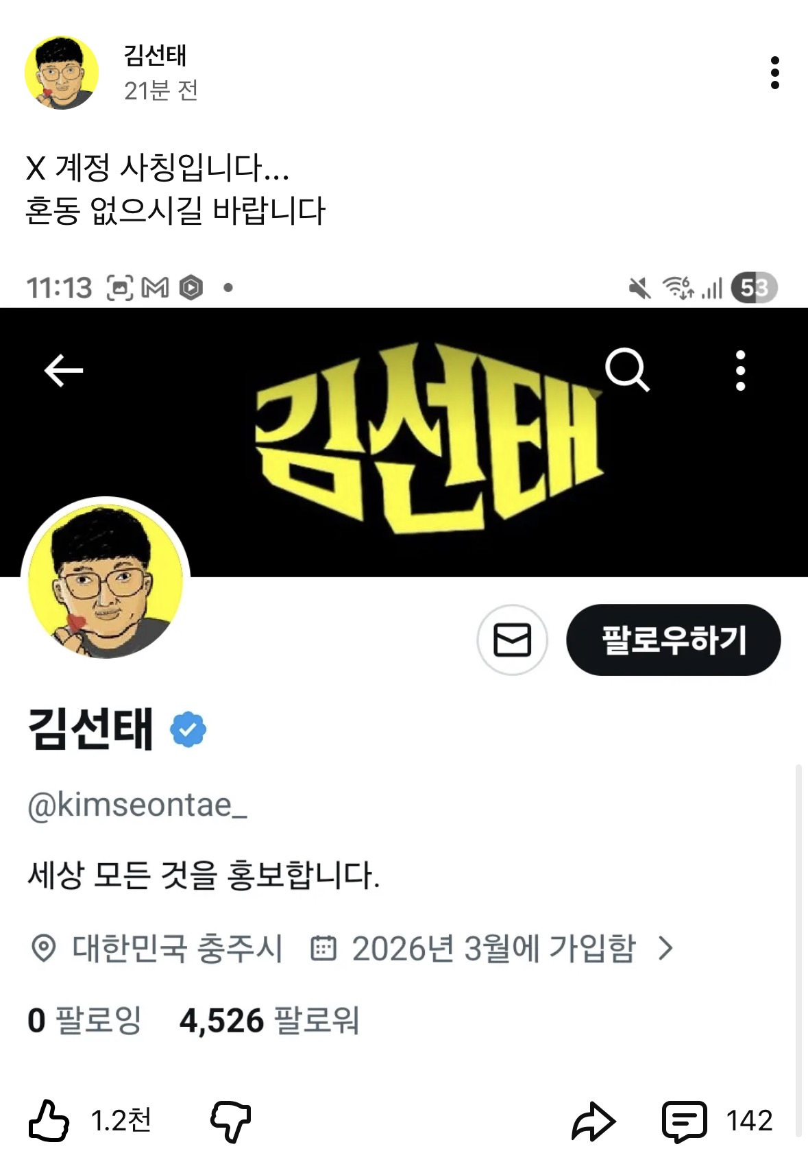 [흥미돋]전 충주맨 김선태 트위터 계정 사칭임 작성자오가닉제품|작성시간26.03.05|조회수19,924 목록 댓글 5 글자크기 작게가 글자크기 크게가 출처: https://theqoo.net/square/4115190901유튜브에 글 올라옴 다음검색 현재 게시글 추가 기능 열기 북마크 공유하기 신고 센터로 신고 댓글 댓글 5 댓글쓰기 답글쓰기 댓글 리스트 작성자미역미역국 | 작성시간 26.03.05 와 트위터 광고 연락 개많이 갔을 텐데 ㄷ 작성자이츠실제상황 | 작성시간 26.03.05 ㅋㅋㅋㅋ대박니네 작성자위풍당당 엔다 | 작성시간 26.03.05 저정도라고...?신기하다... 작성자호랑이양고 | 작성시간 26.03.05 팔로워 빨아먹고 계정 팔려는걸걸 ㅋㅋㅋ 작성자갤런=악마의 단위 | 작성시간 26.03.05 짝퉁이 잇어야 명품이다 ㄷㄷ 댓글 전체보기