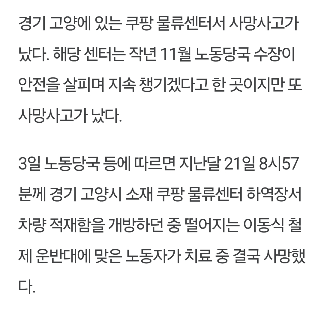 [여시뉴스데스크]고양 쿠팡 물류센터서 사망사고 발생 작성자이제는|작성시간26.03.05|조회수11,091 목록 댓글 12 글자크기 작게가 글자크기 크게가 출처: https://www.safetynews.co.kr/news/articleView.html?idxno=246412고양 쿠팡 물류센터서 사망사고 발생 - 안전신문경기 고양에 있는 쿠팡 물류센터서 사망사고가 났다. 해당 센터는 작년 11월 노동당국 수장이 안전을 살피며 지속 챙기겠다고 한 곳이지만 또 사망사고가 났다.3일 노동당국 등에 따르면 지난달 www.safetynews.co.kr 다음검색 현재 게시글 추가 기능 열기 북마크 공유하기 신고 센터로 신고 댓글 댓글 12 댓글쓰기 답글쓰기 댓글 리스트 작성자일곱해의 마지막 | 작성시간 26.03.05 에효 너무속상하다ㅠㅠ 작성자고 준 | 작성시간 26.03.05 쿠팡은 변함없네ㅡㅡ 작성자말차두쫀볼 | 작성시간 26.03.05 삼가 고인의 명복을 빕니다 작성자뻐끔뻐끔 | 작성시간 26.03.05 삼가 고인의 명복을 빕니다 작성자동이동이동동 | 작성시간 26.03.05 하..... 또.....,? 댓글 전체보기
